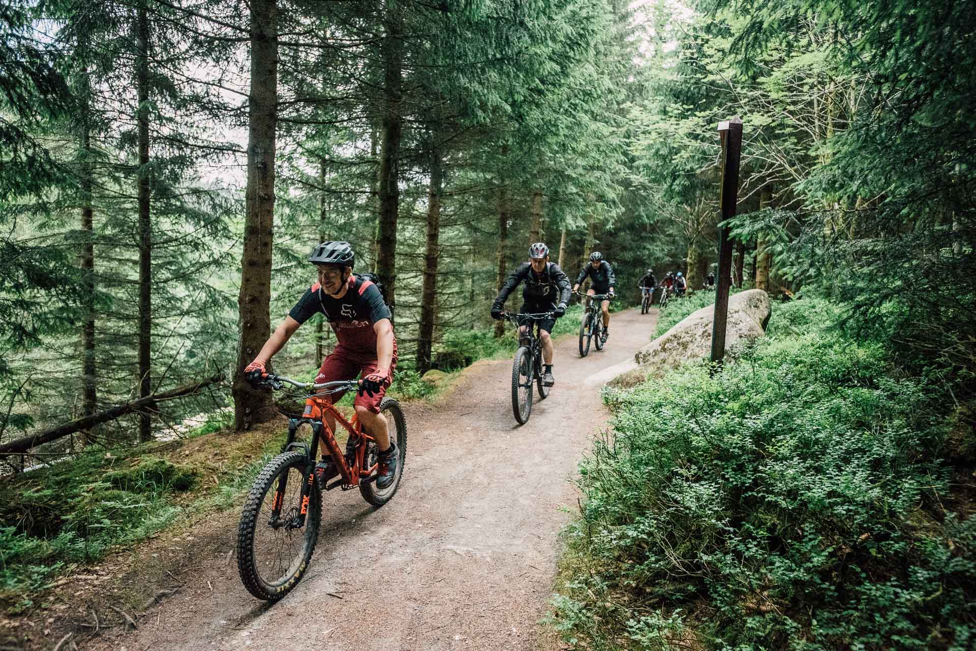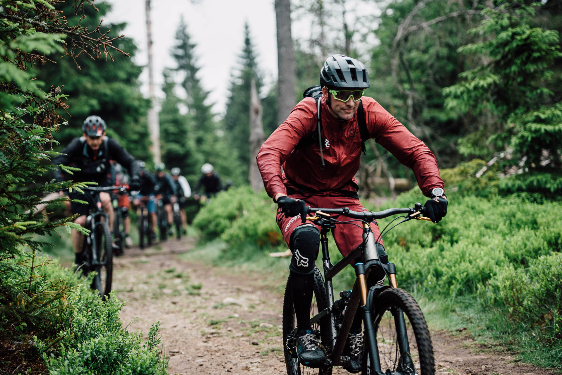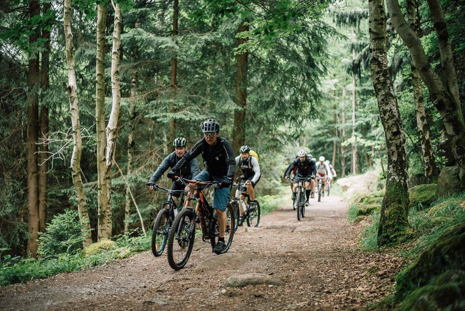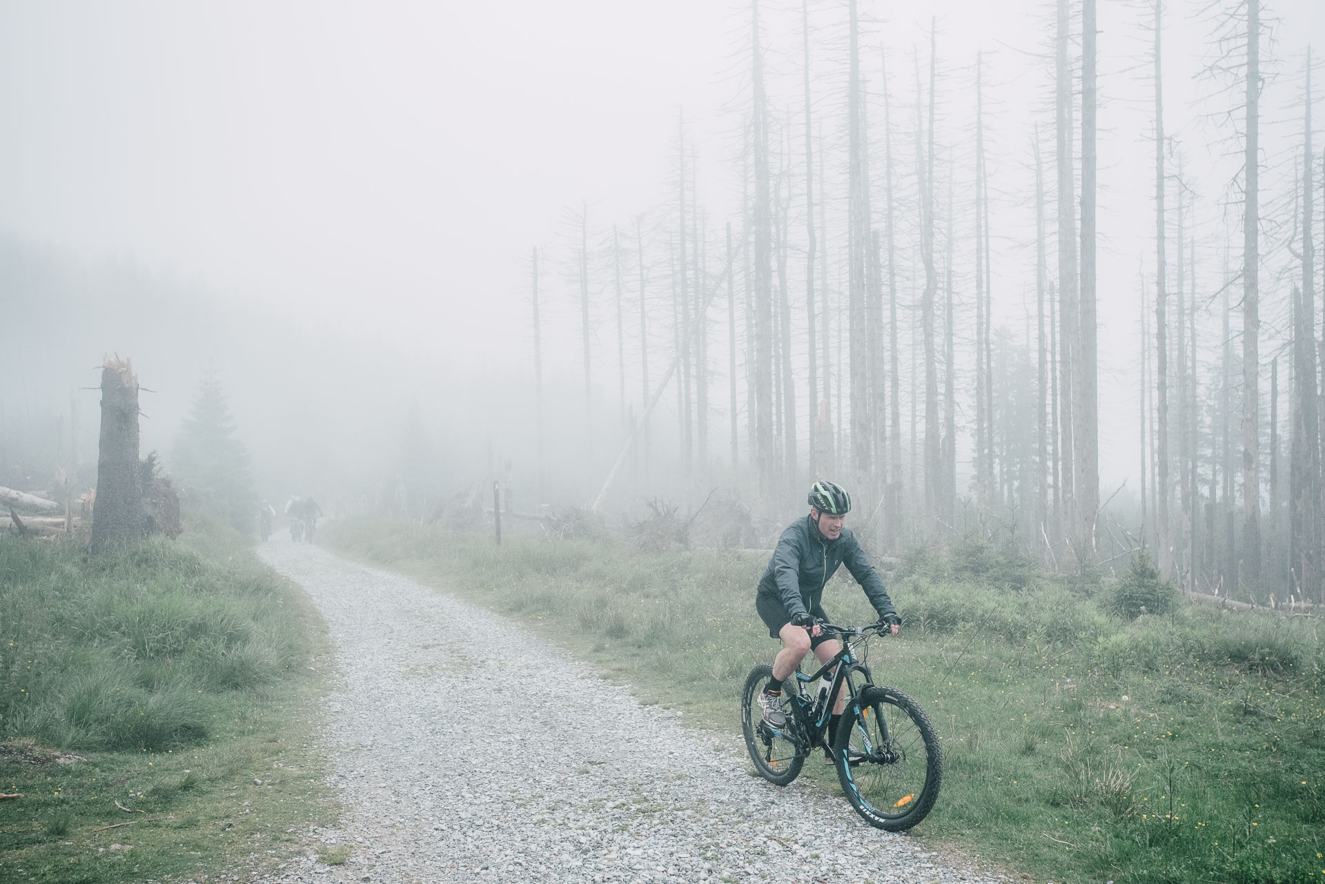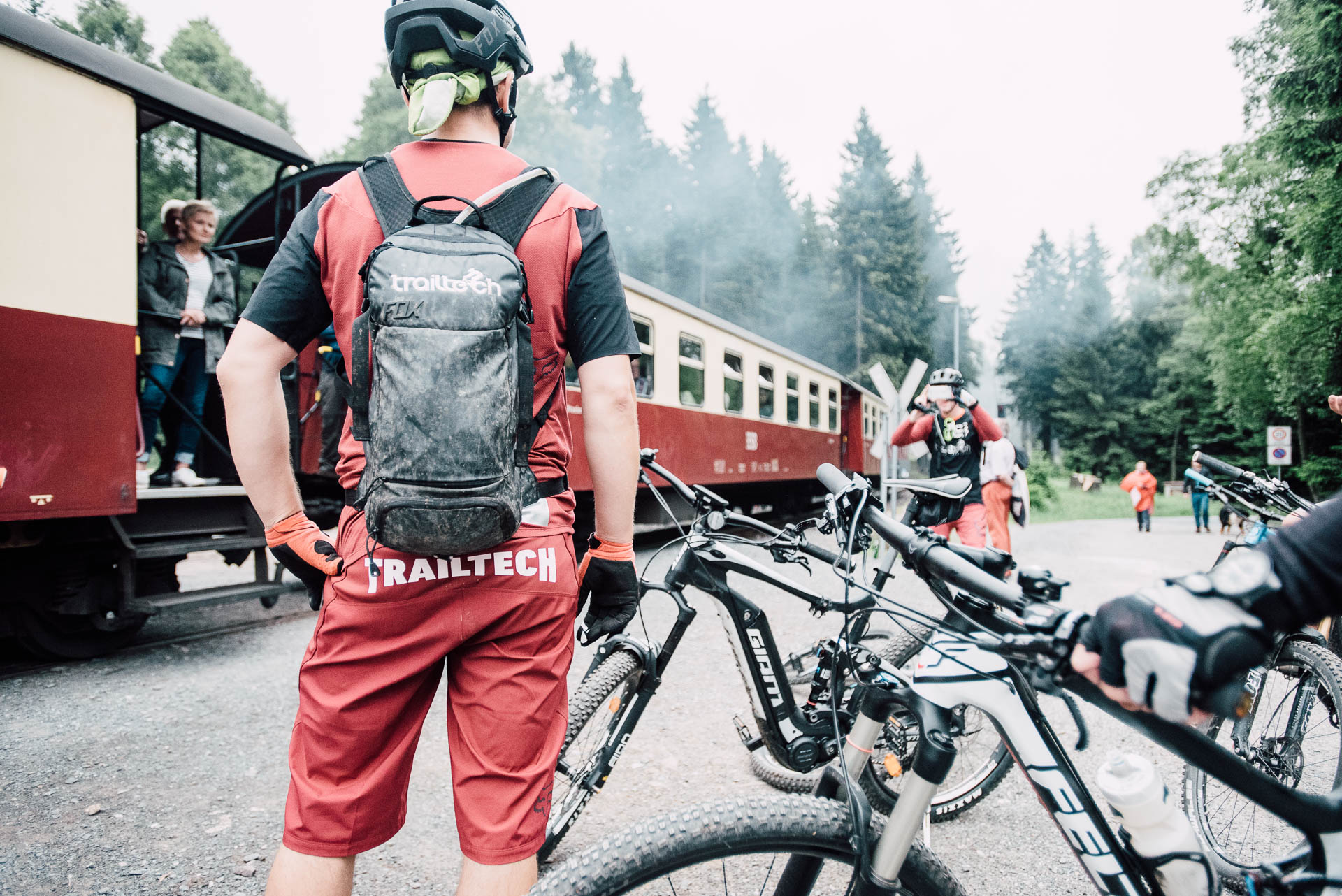 Die Reifen holpern über die Wurzeln der unzähligen Fichten, Nadeln spritzen auf, Reifen drehen durch und Federelemente gleichen schmatzend die Schläge und Unebenheten des Weges aus. Der Wald öffnet sich ein wenig und eine kleine Lichtung mit einer alten Holzbrücke taucht vor uns auf. Wir folgen dem Pfad über die Brücke, atmen tief ein und aus und schalten noch mal ein paar Gänge zurück. Der nächste Forstweg ist gleich erreicht, knirschender Kies und wir können erst mal durchatmen. Gleichmäßiger Tritt, Höhenmeter um Höhenmeter, der Himmel ist von leichten Wolken bedeckt, es ist angenehm warm. Der Blick geht nach rechts, im Wald tauchen große Steinklippen auf, überragen teilweise die Gipfel der Bäume. Auch der Untergrund wird steiniger, verblockter und wir müssen richtig arbeiten. Das Bike laufen lassen, locker bleiben, den Blick voranschicken, Linien suchen, Spaß und Flow finden. Ein weiterer Forstweg, durchatmen, erste Sonnenstrahlen brechen durch die Wolken, Schweißperlen kleben an der Stirn. Der nächste Anstieg, ein Schluck aus dem Trinkschlauch und wir hören in der Ferne das Tuten der Brockenbahn. Der Stieg wird rutschiger, Wasser rinnt zwischen den Steinen, Geröll lässt das Vorderrad springen, volle Konzentration. Wir kämpfen uns weiter voran, der Fichtenwald ist von kranken und toten Bäumen durchzogen, Nebel zieht auf, traurig, mystisch und schön zugleich. Ein gigantischer Ausblick ins Tal, wir saugen die Morgenluft und den Augenblick ein, wunderschön. Es geht bergab, weicher und leiser Waldboden, Fahrtwind und Dreckspritzer im Gesicht, Moos an den Bäumen, wir erreichen die nächste Kreuzung. In der Ferne ein Wasser, eine Talsperre, kleine Klippen und Hügel durchziehen die Landschaft unter uns, wir lösen die Bremsen und rollen los. Die Sonne steht schon tiefer, die Gesichter müde aber glücklich, es geht wieder bergan, noch eine letzte kurze Pause, dann geht es bergab, entlang des Wassergrabensrollen wir Richtung Süden. Ausrollen auf dem Parkplatz, Abklatschen und Lachen, ein Schierker zum Abschied. Schön das Ihr dabei wart.