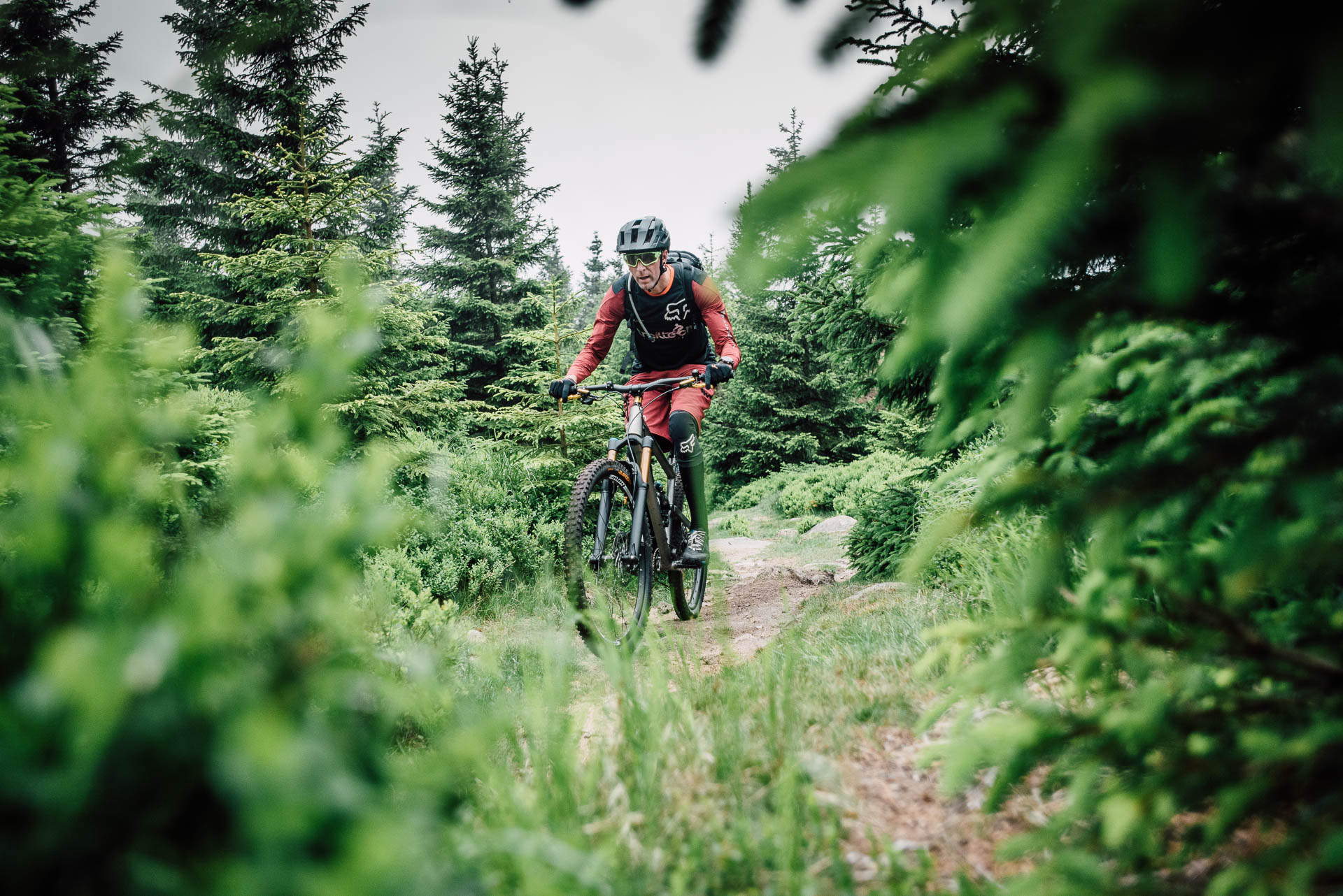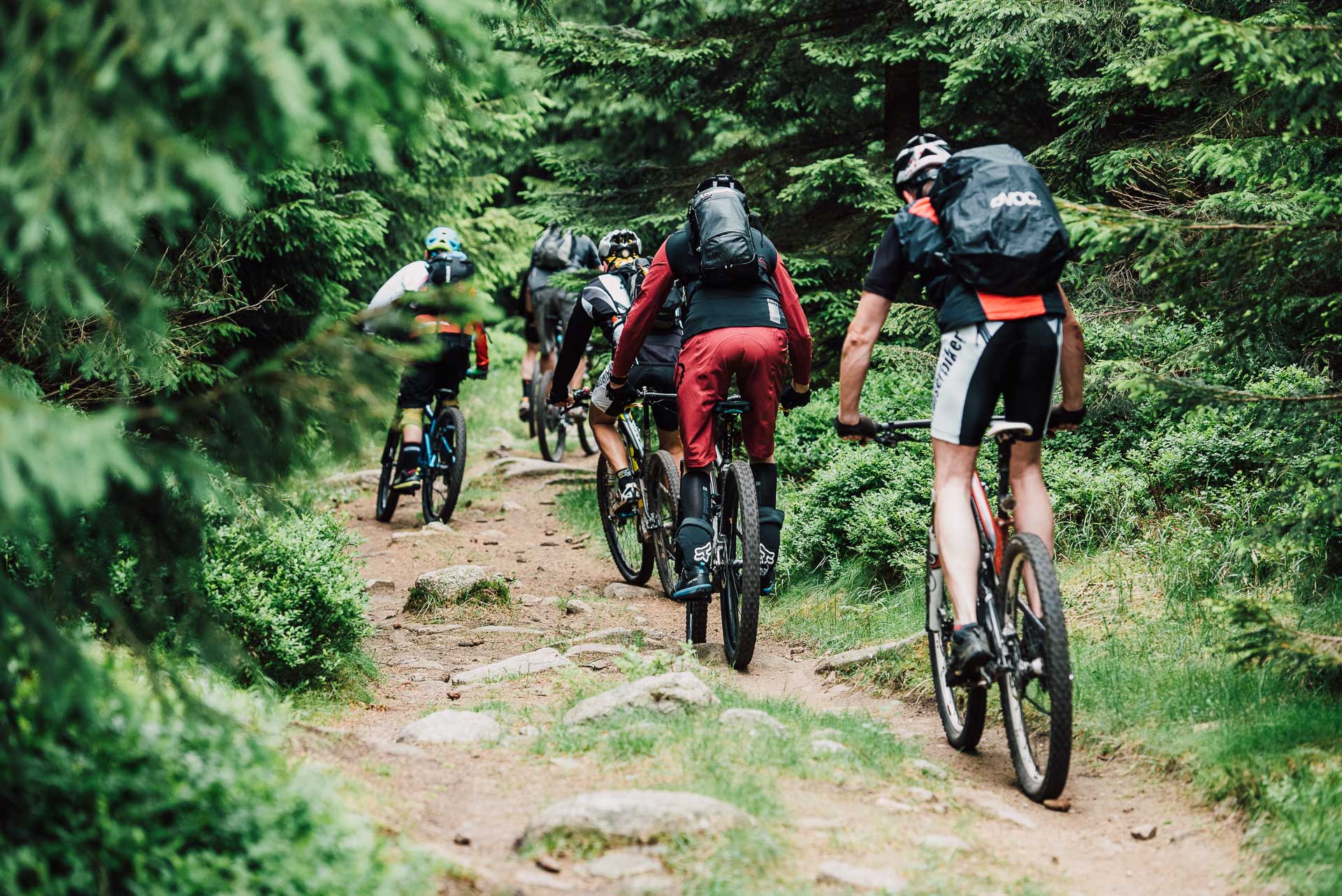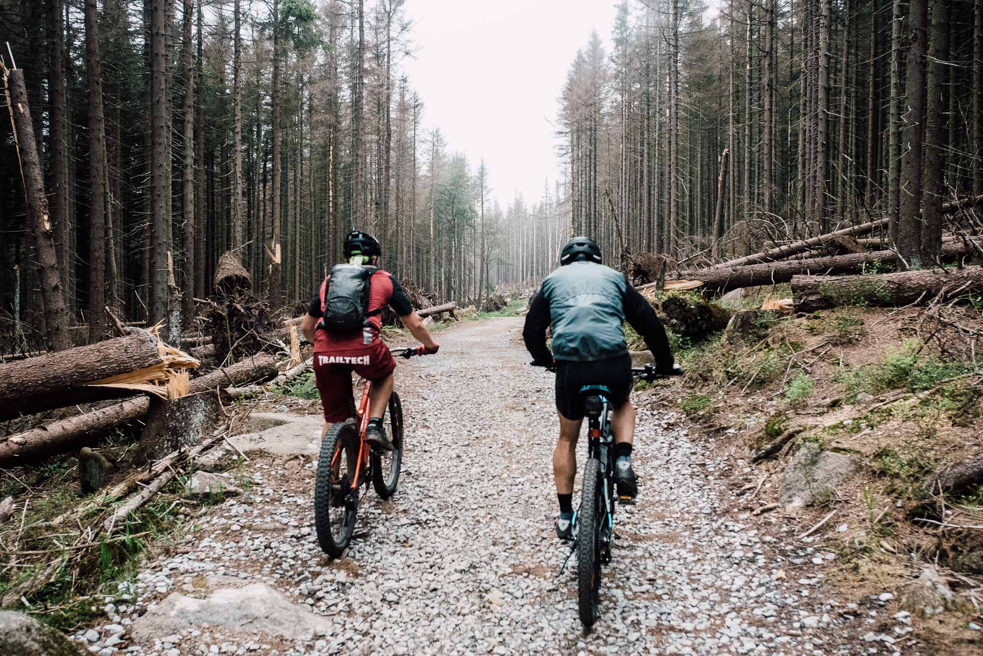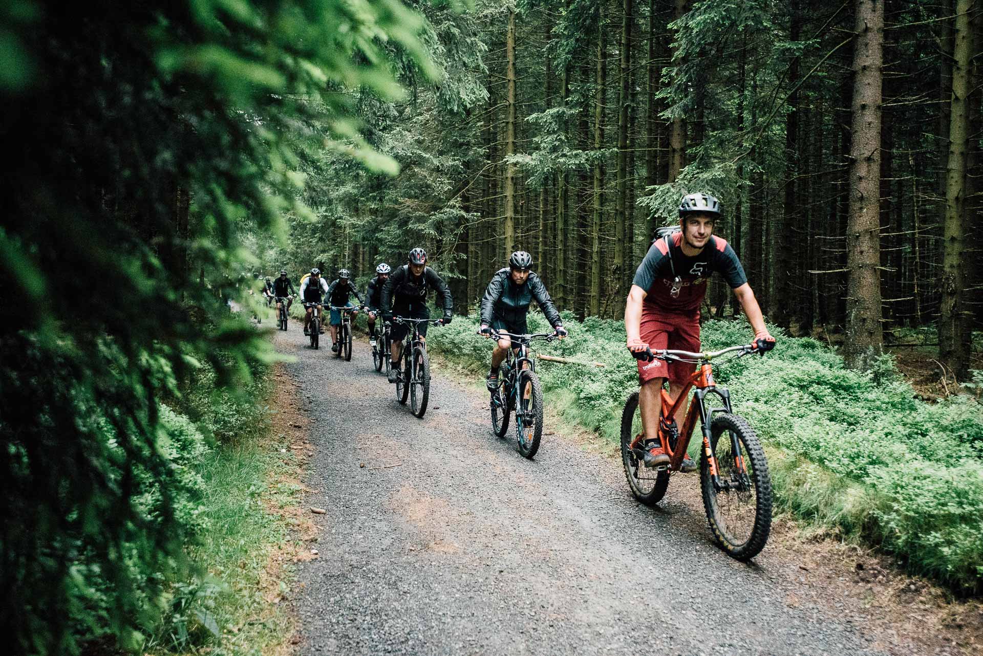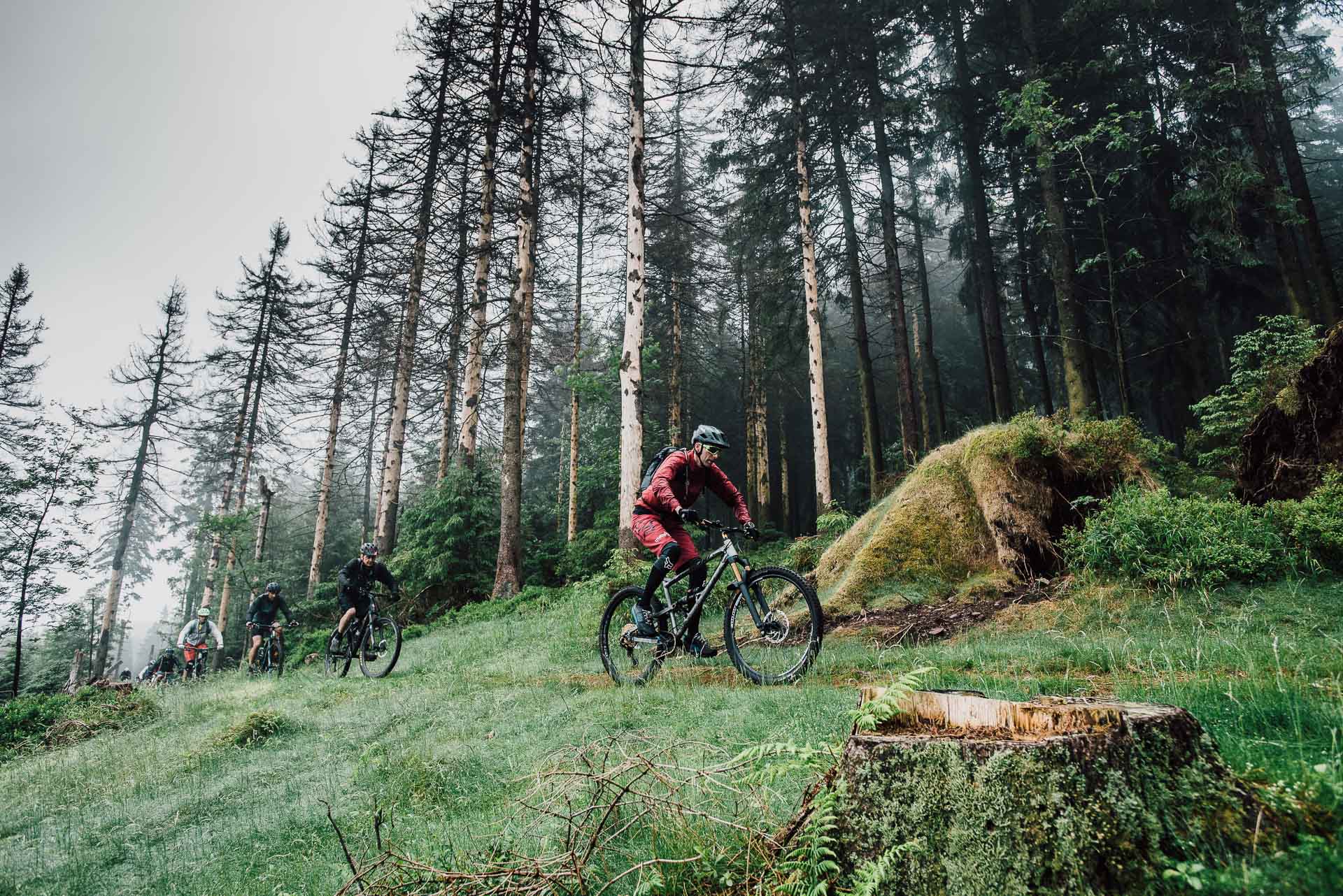 Die Reifen holpern über die Wurzeln der unzähligen Fichten, Nadeln spritzen auf, Reifen drehen durch und Federelemente gleichen schmatzend die Schläge und Unebenheten des Weges aus. Der Wald öffnet sich ein wenig und eine kleine Lichtung mit einer alten Holzbrücke taucht vor uns auf. Wir folgen dem Pfad über die Brücke, atmen tief ein und aus und schalten noch mal ein paar Gänge zurück. Der nächste Forstweg ist gleich erreicht, knirschender Kies und wir können erst mal durchatmen. Gleichmäßiger Tritt, Höhenmeter um Höhenmeter, der Himmel ist von leichten Wolken bedeckt, es ist angenehm warm. Der Blick geht nach rechts, im Wald tauchen große Steinklippen auf, überragen teilweise die Gipfel der Bäume. Auch der Untergrund wird steiniger, verblockter und wir müssen richtig arbeiten. Das Bike laufen lassen, locker bleiben, den Blick voranschicken, Linien suchen, Spaß und Flow finden. Ein weiterer Forstweg, durchatmen, erste Sonnenstrahlen brechen durch die Wolken, Schweißperlen kleben an der Stirn. Der nächste Anstieg, ein Schluck aus dem Trinkschlauch und wir hören in der Ferne das Tuten der Brockenbahn. Der Stieg wird rutschiger, Wasser rinnt zwischen den Steinen, Geröll lässt das Vorderrad springen, volle Konzentration. Wir kämpfen uns weiter voran, der Fichtenwald ist von kranken und toten Bäumen durchzogen, Nebel zieht auf, traurig, mystisch und schön zugleich. Ein gigantischer Ausblick ins Tal, wir saugen die Morgenluft und den Augenblick ein, wunderschön. Es geht bergab, weicher und leiser Waldboden, Fahrtwind und Dreckspritzer im Gesicht, Moos an den Bäumen, wir erreichen die nächste Kreuzung. In der Ferne ein Wasser, eine Talsperre, kleine Klippen und Hügel durchziehen die Landschaft unter uns, wir lösen die Bremsen und rollen los. Die Sonne steht schon tiefer, die Gesichter müde aber glücklich, es geht wieder bergan, noch eine letzte kurze Pause, dann geht es bergab, entlang des Wassergrabensrollen wir Richtung Süden. Ausrollen auf dem Parkplatz, Abklatschen und Lachen, ein Schierker zum Abschied. Schön das Ihr dabei wart.