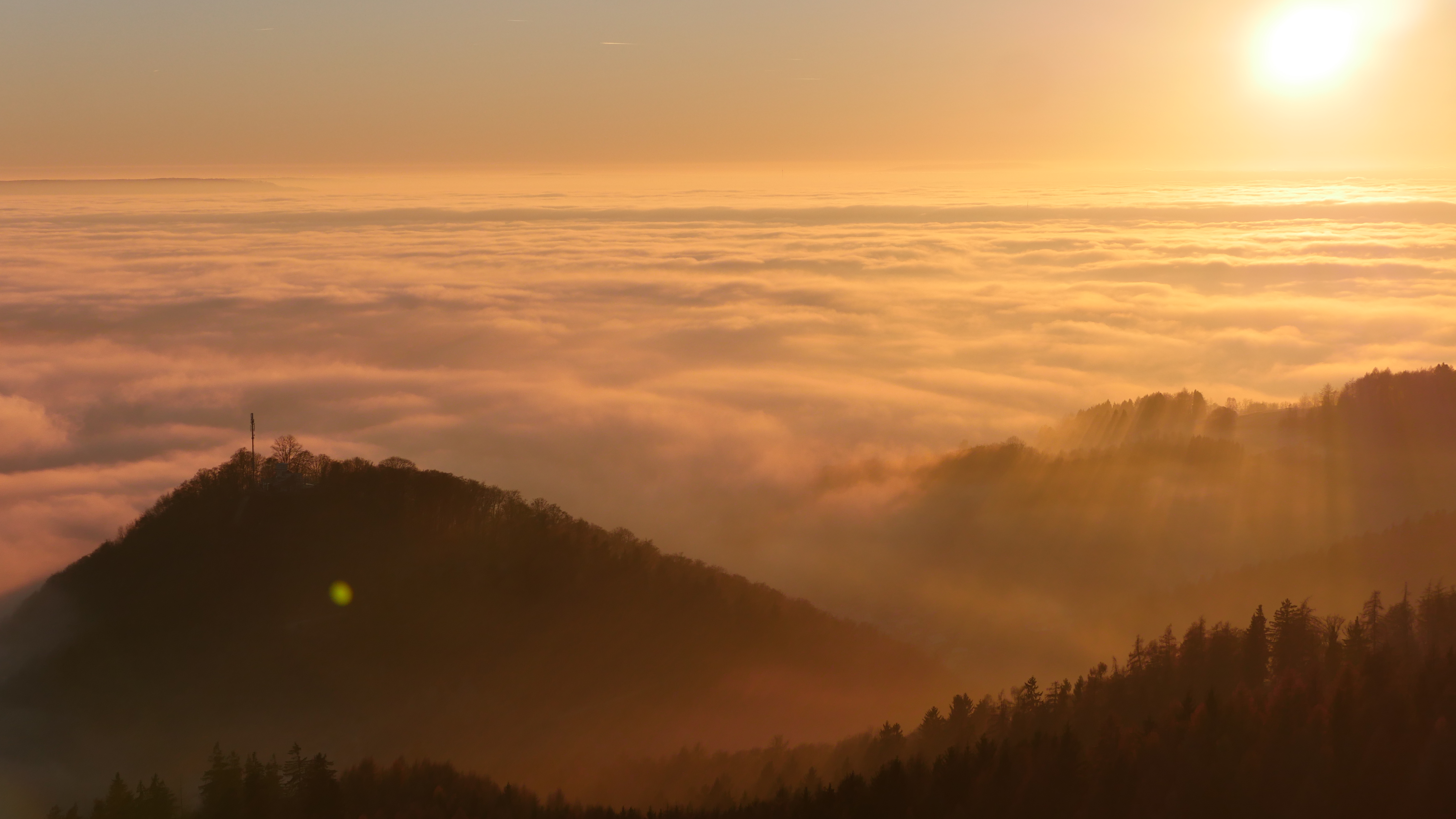 Die letzten Strahlen der Sonne fallen durch die Bäume.