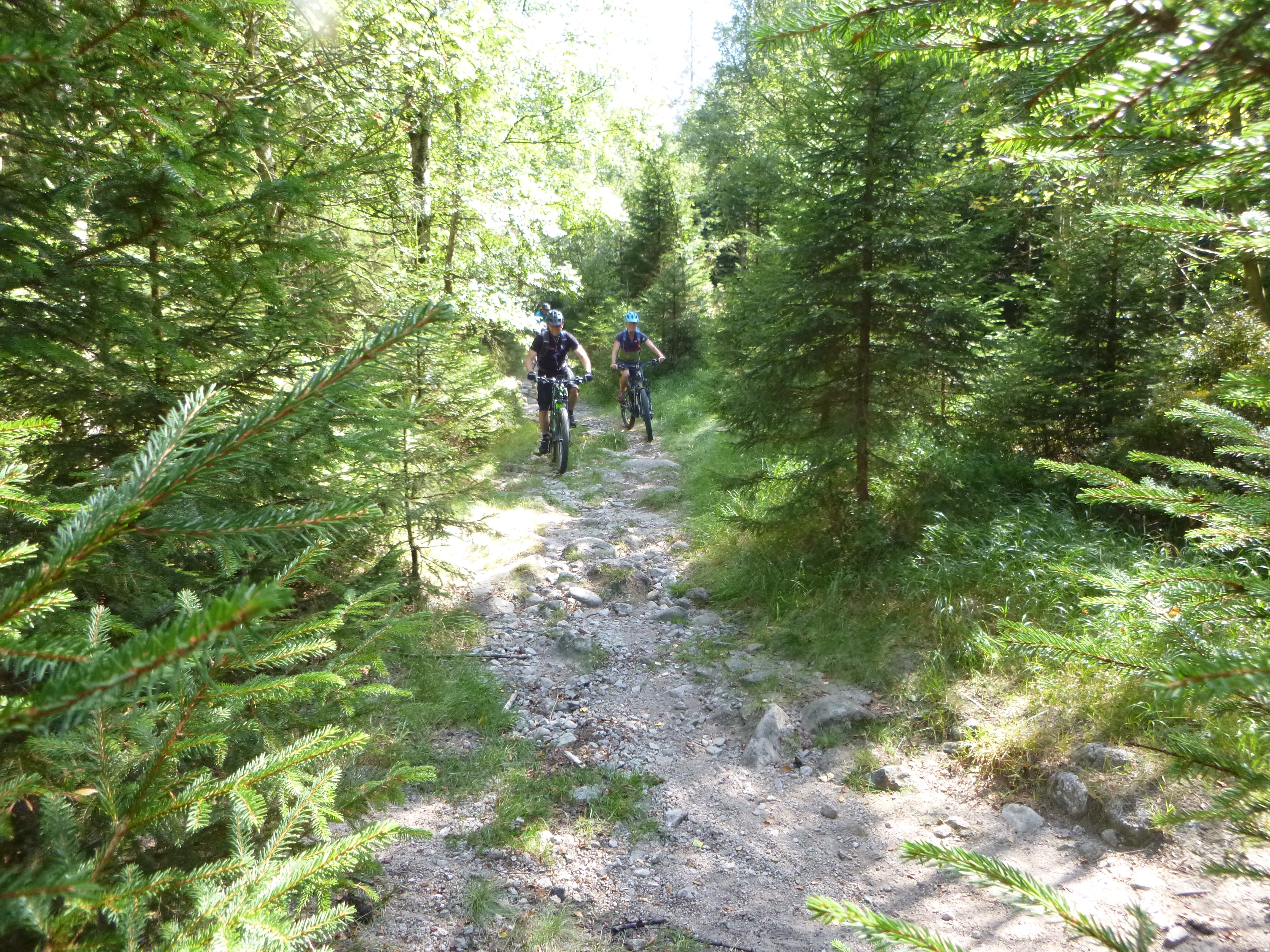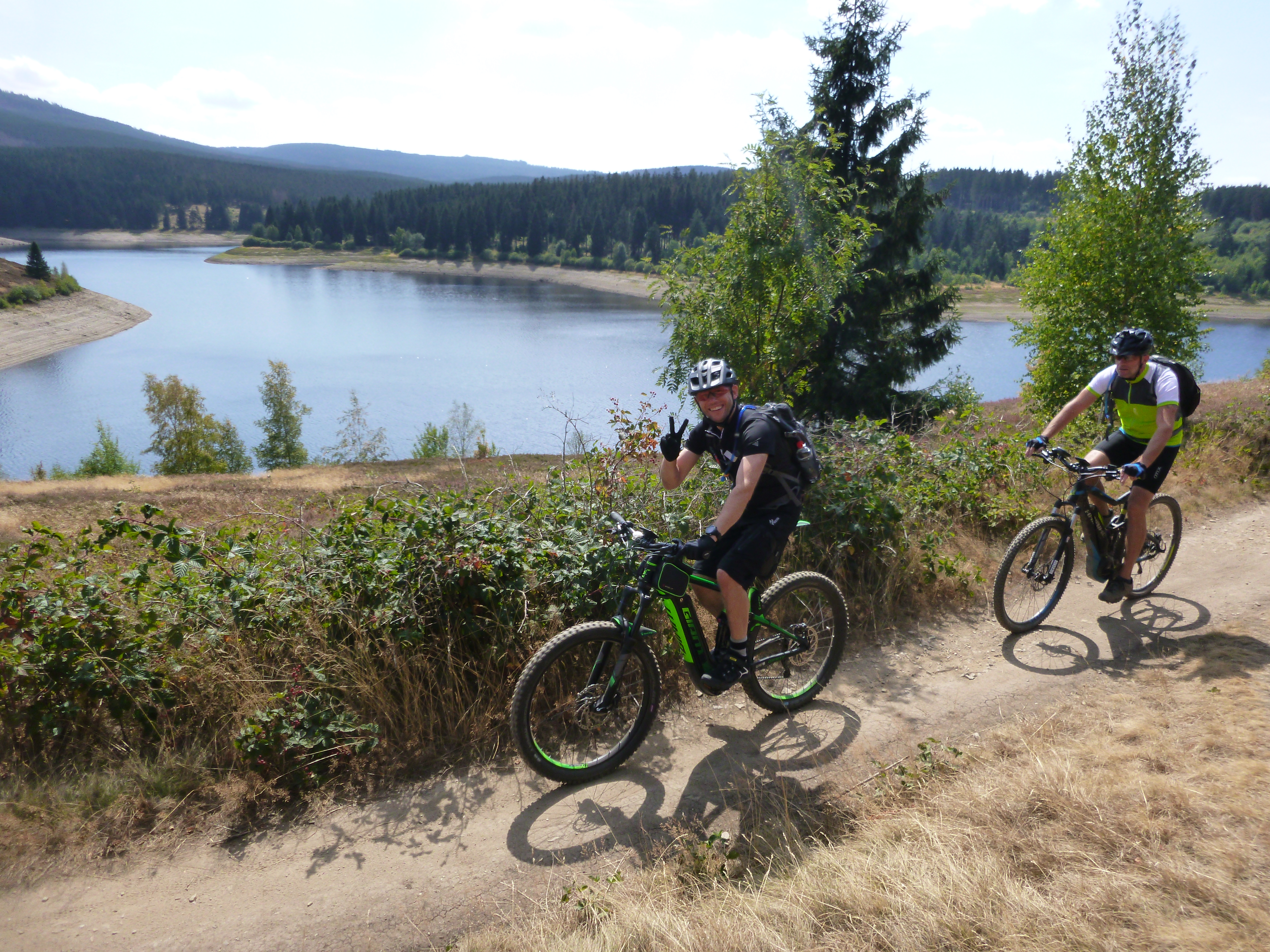 Los ging es nach der Einstellung der Bikes und einem kurzen Briefing von Braunlage aus in Richtung Norden, vorbei am Achtermann, dem Oderstausee, Torfhaus, der Marienteichbaude, dem Radautal und dem Winterberg über Bad Harzburg. Eine kurze Mittagspause gab es dann am Molkenhaus, wo wir auch unsere Akkus kurz an die Ladegeräte hängen konnten. Zwar wären wir am Ende sicher auch ohne erneute Ladung ausgekommen, aber öfter mal in den Turbo und Sport Modus zu schalten macht ja auch eine Menge Spaß. Nach der Pause querten wir noch die Eckerstaumauer und ließen die Scharfensteinklippe links liegen, um über die oberer Eckerquerung, den Goetheweg und Eckersprung wieder in Richtung Süden zu fahren. Ein kleiner Abstecher über den Ulmer Weg hinauf zum Wurmberg durfte am Ende auch nicht fehlen und so gelangten wir über die – leider super ungepflegten Trails des Bikeparks Braunlage (sehr schade eigentlich…) zurück zum Ausgangspunkt unserer Tour. Dort gab es standesgemäß mal wieder einen kleinen Schierker zwischen die vom Grinsen verzerrten Lippen. SUPER Tag mit einer tollen Gruppe. Das war wirklich E-PIC ;) Danke dafür nochmal!