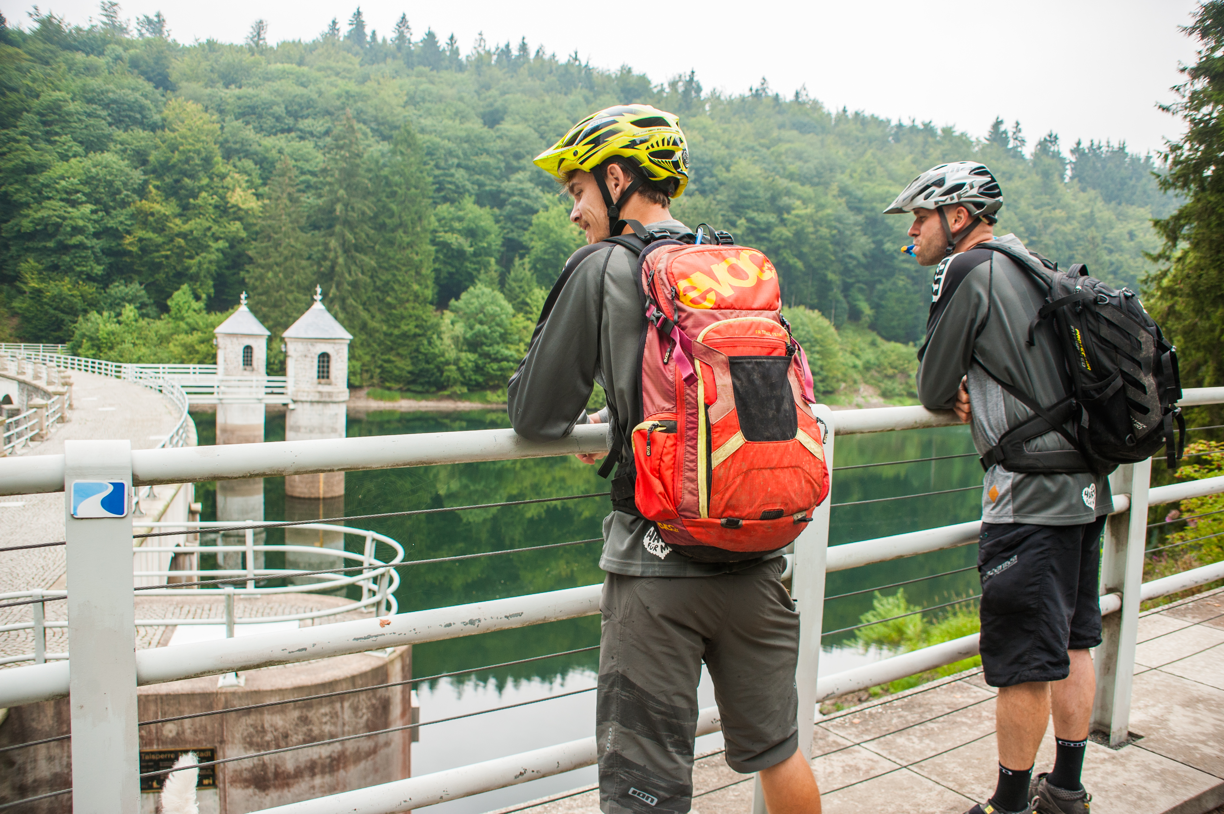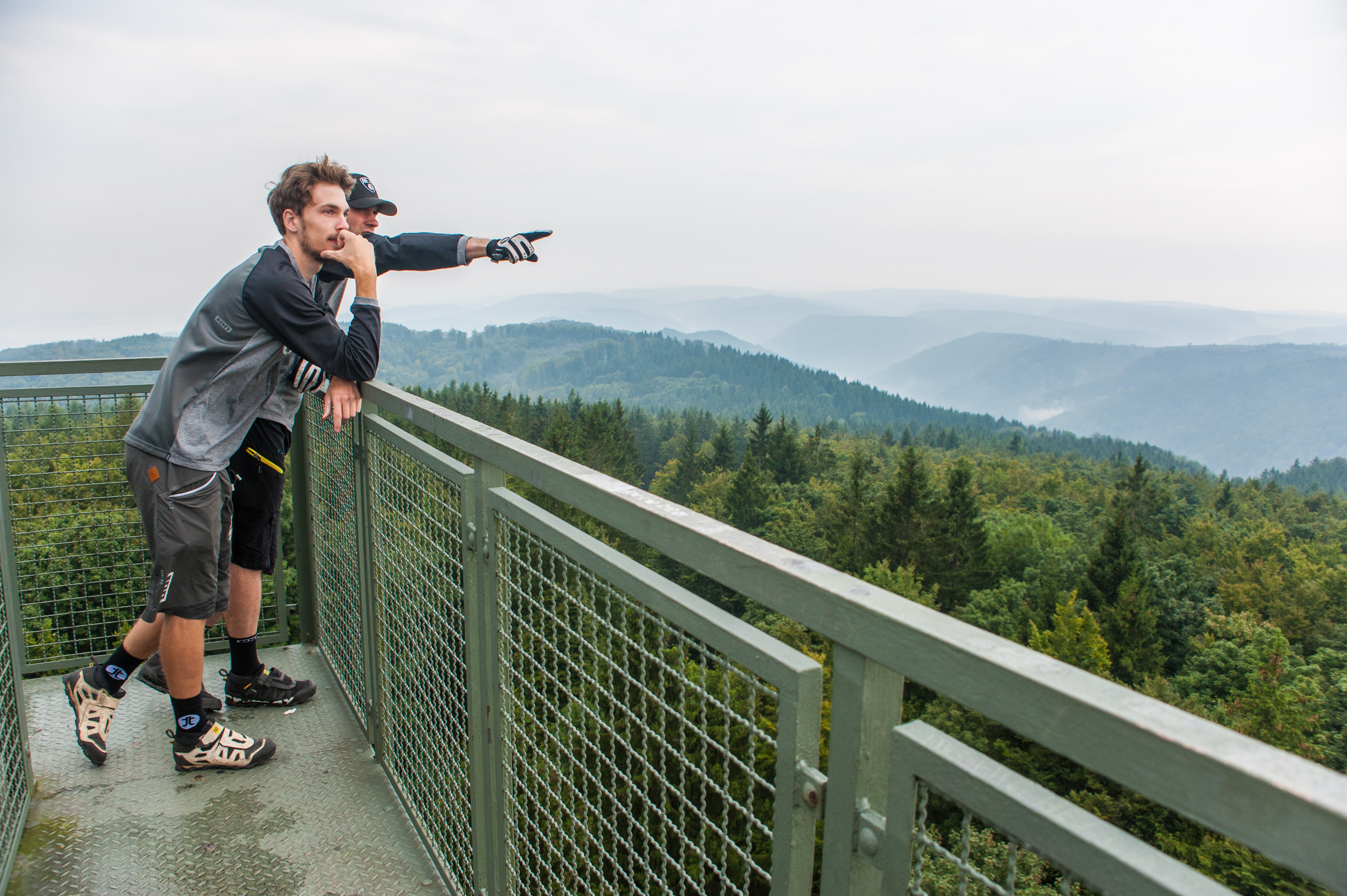 Erst steil und dann flowig, geht der Weg hinab über den roten lehmigen Boden. Unten angekommen fahren wir am Ufer des Stausees entlang und Treten über das Hufhaus hinauf zum Poppenturm. Der Turm ist das Wahrzeichen von Ilfeld und wird liebevoll als „Ilfelder Eifelturm“ bezeichnet. Mit 33,5 Metern der perfekte Ort um unsere Tour weiter zu planen. Von seiner Aussichtsplattform überblickt man den ganzen Harz und kann sogar ab und an den Herkules in Kassel am Horizont ausmachen. Heute ist die Sicht leider etwas eingeschränkt, aber da sich das Wetter bessert und die Wolken sich langsam verziehen, entscheiden wir uns für die große Runde. Wer möchte kann auch hier schon abkürzen und den Trail zum Falkenstein nehmen.