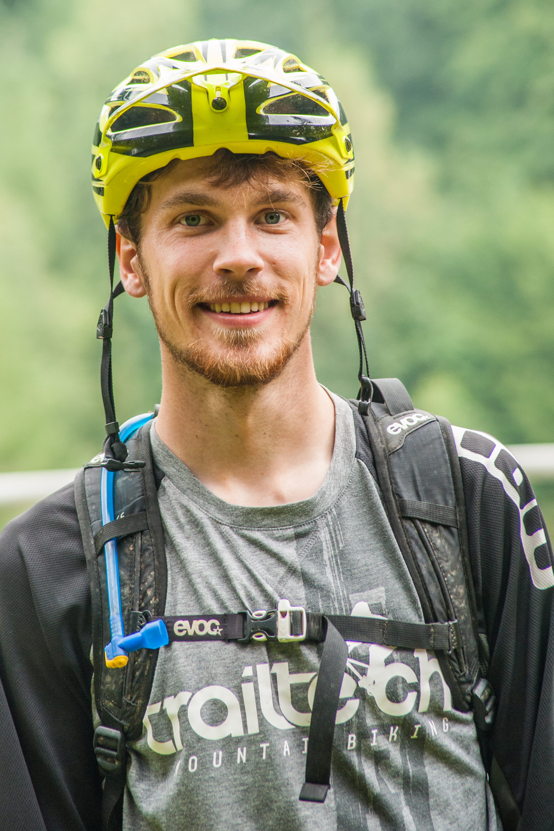T3 die alte gepflasterte Dorfstraße hinaufgefahren und biegt vor mir auf den Schotterparkplatz des Ilfelder Sportplatz ein. Stefan springt heraus und mit Ihm seine beiden Traildogs, Lotte und Dikke. Seit einigen Jahren arbeiten wir zusammen für die Bikeschule und den Tourenanbieter TRAILTECH. Stefan kommt aus Nordhausen und kennt sich in der Region bestens aus. Als Zweiradmechaniker, Clubbesitzer und Guide, führt er fast jedes Wochenende Gruppen aus Deutschland und Dänemark durch seine Heimat. Abseits von Nationalparkwahnsinn, Trailsperrungen und Touristenströmen, kann man hier noch Ruhe und Natur genießen. Ich selber kenne im Rest des Harzes jeden Winkel, gebe Fahrtechnikkurse und Guide.