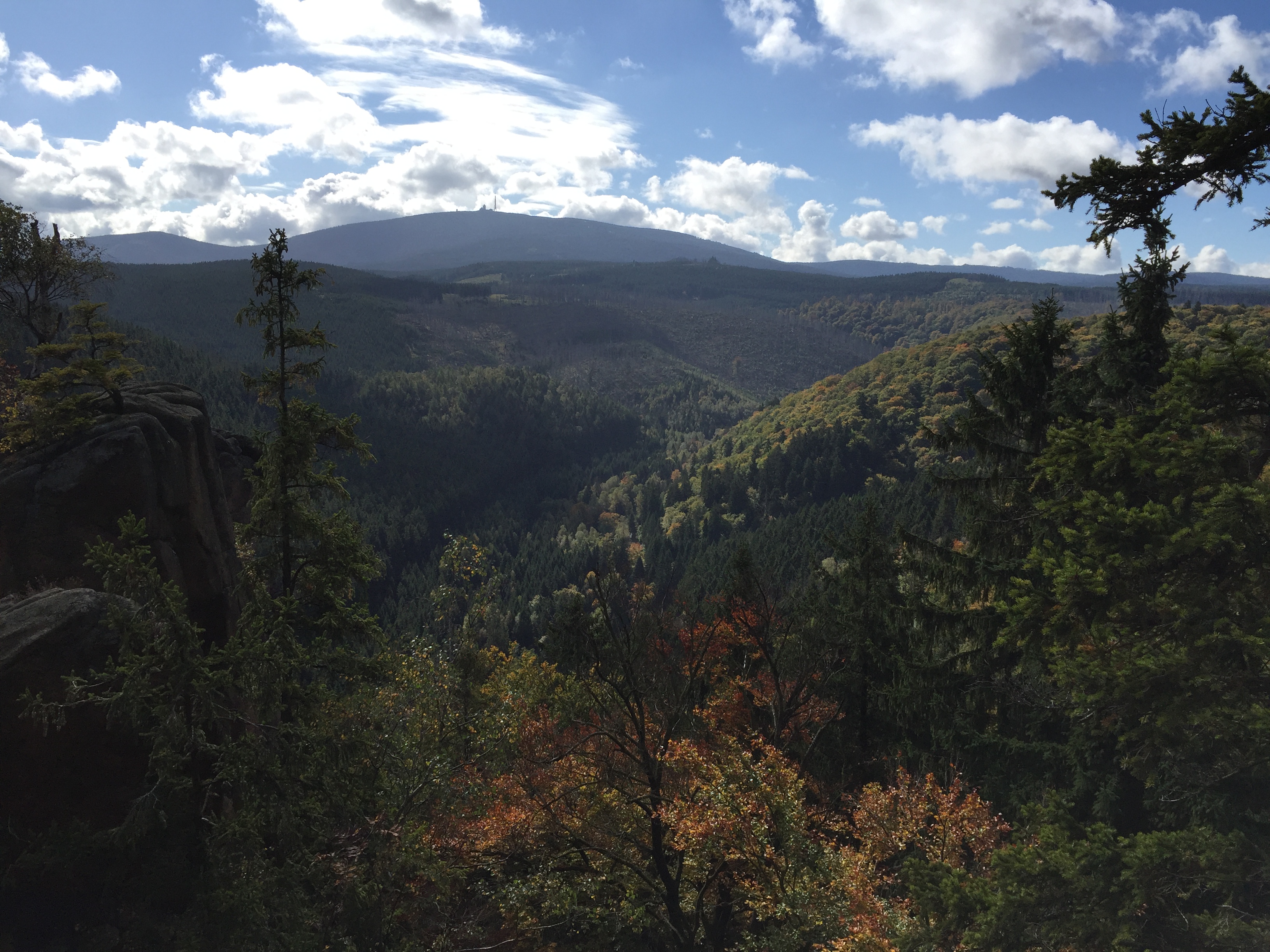 Blick über die weiten Wälder des Eckertals und hinauf zum Brocken.