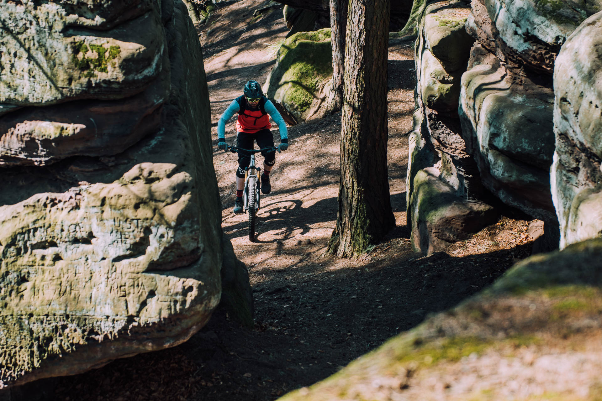Der Duft von frisch geschlagenem Holz liegt in der Luft. Ich lasse mich durch den Wald treiben. Licht und Schatten wechseln sich ab und ich spüre die Kühle des kleinen Baches neben dem Weg. Die Sonnenstrahlen fallen durch die noch blätterlosen Bäume, ich schalte einen Gang hoch und halte mich an der Kreuzung links. Noch ein kurzer, letzter Anstieg und ich bin an meinem ersten Ziel angekommen. Mich erwartet ein heimlicher Märchenwald mit bizarren Felsformationen, uralten Eichen und herrlichen Aussichten ins Umland. Kleine Pfade schlängeln sich durch die Landschaft, Lärchennadeln und Sand dämpfen das Abrollgeräusch meiner Reifen und griffige Wurzeln bringen mein Fahrwerk zum Arbeiten. Dieser Spot ist ein wahrer Spielplatz, erfordert definitiv Konzentration wirkt aber gleichzeitig auch entspannend und beruhigend. Das Gestein ist griffig und die Sektionen bieten zahlreiche Möglichkeiten für die unterschiedlichsten Linien. Noch ein schmaler Spalt zwischen den mächtigen, aufgetürmtem Felsbrocken, ein weiterer kleiner Balanceakt entlang einer schmalen Kante und ein kniffliger Drop hinein in eine Böschung. Maximale Konzentration, hier ist Kontrolle gefragt. Dann öffne ich die Bremsen, lasse mich über einen handtuchbreiten Singletrail und ein weites Plateau rollen, spiele mit den Bodenwellen. Der Fahrtwind kühlt, die Sonne steht jetzt schon tiefer und meine Gedanken schweifen ab. Ich bin schon schon bei der nächste Etappe meiner Tour, es geht immer weiter. Das nächste kleine Abenteuer vor der Haustür.