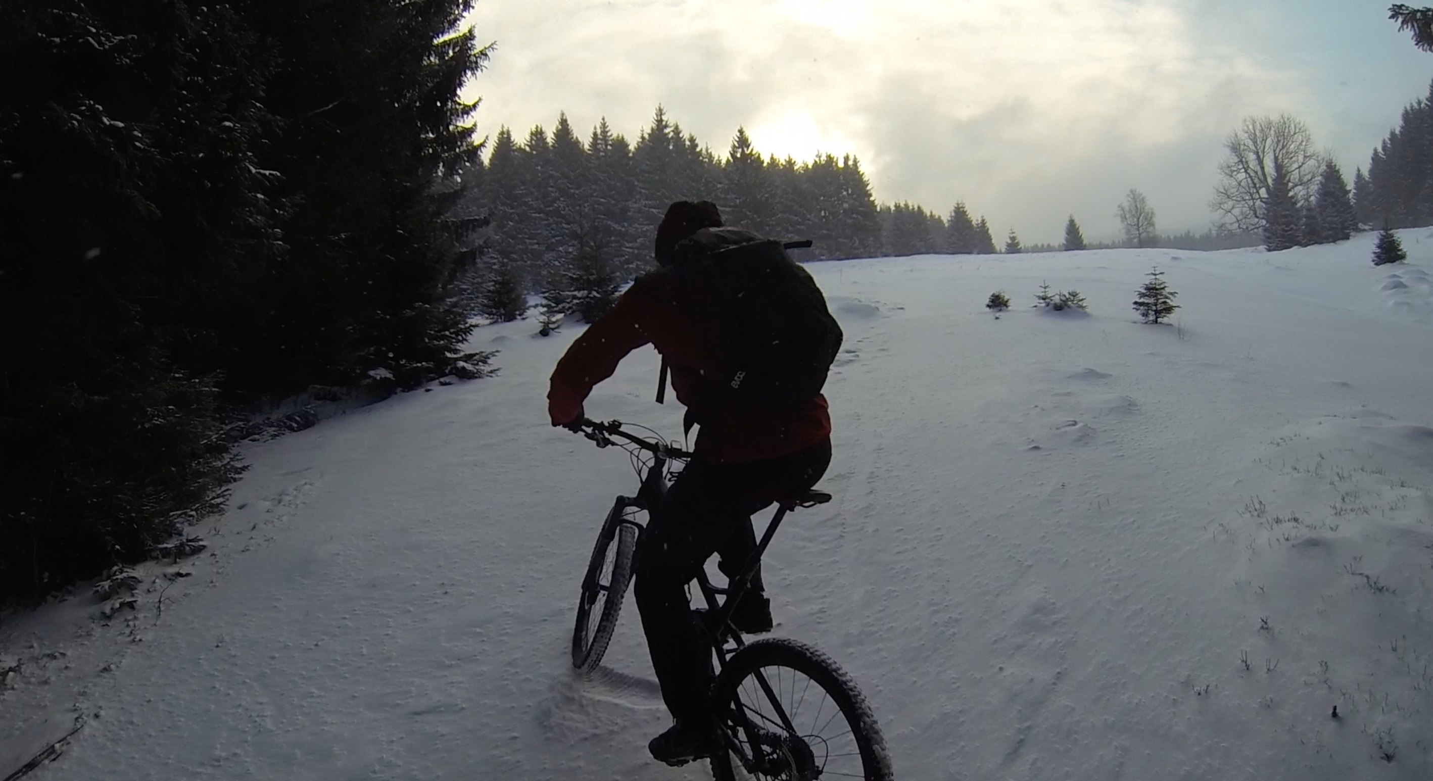 Tiefschneespaß mit dem Fatbike auf der Abfahrt vom Gipfel.