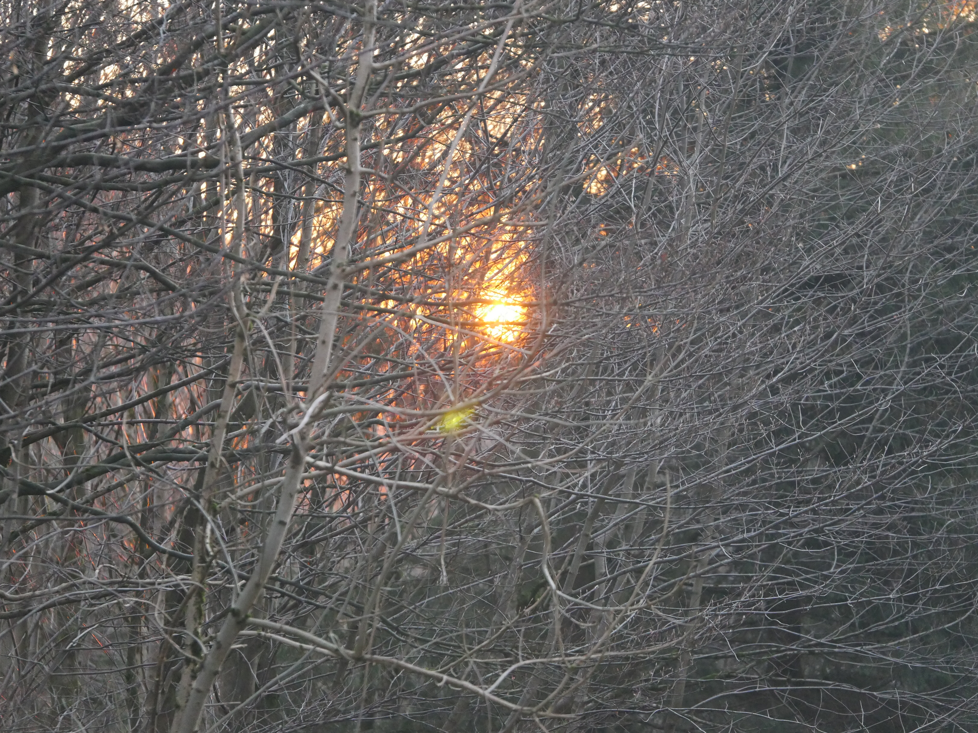 Die letzten Sonnenstrahlen scheinen durch die Äste.