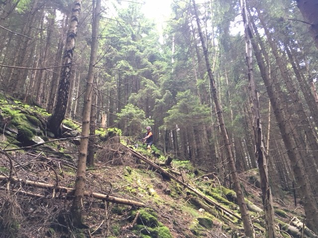 Trails durch dichten Fichtenwald.