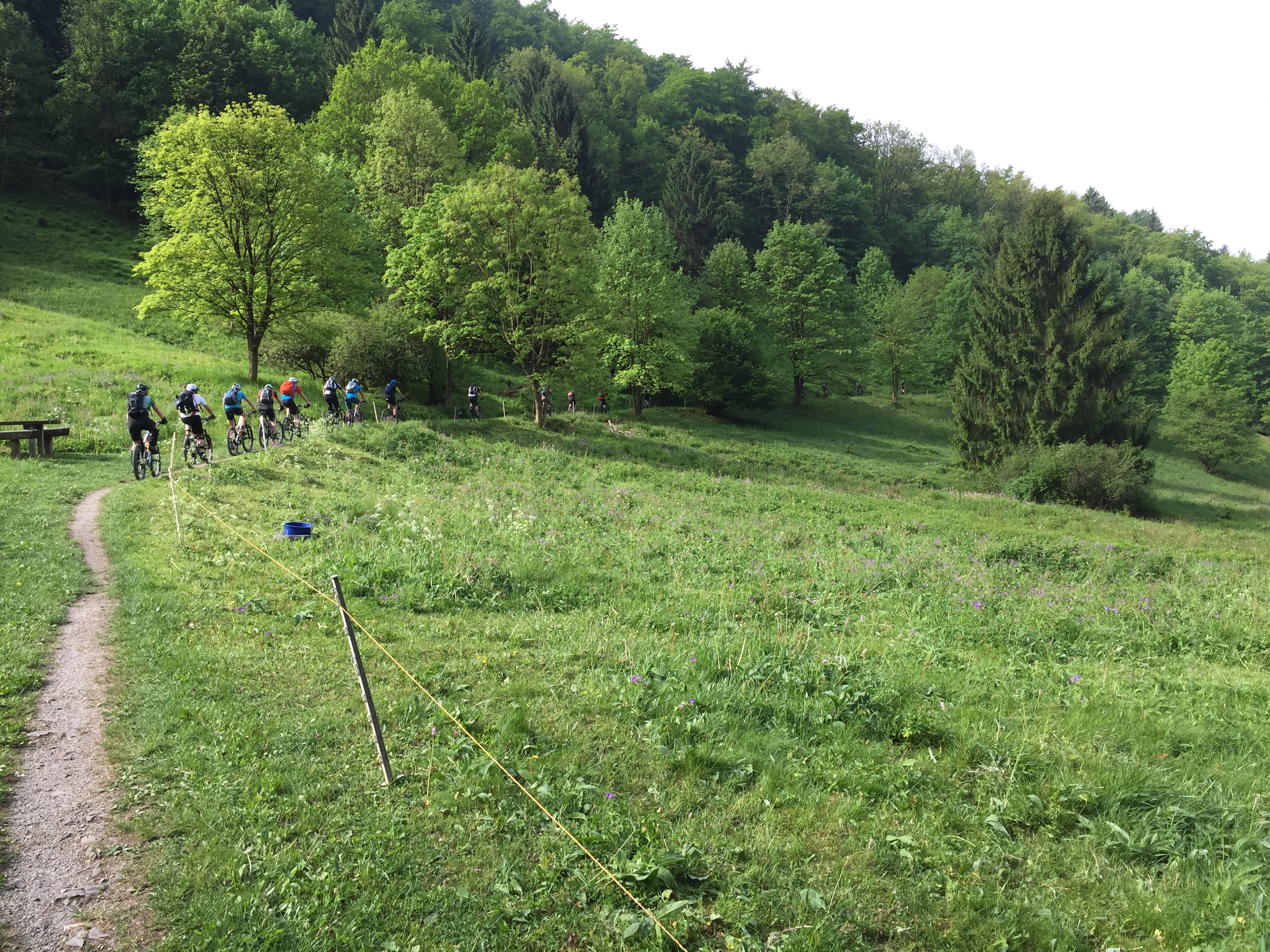 Der nächste Tag und die zweite Etappe startete nach dem Frühstück mit einer kleinen Extrarunde um Bad Grund herum, wo uns Local Hannes einige schöne Trails präsentieren konnte. Heute sollte es weit in den Süd-Osten nach Bad Lauterberg gehen und die Strecke war vollgestopft mit vielen schönen Grabenwegen, Trails und herrlichen Aussichtspunkten. Unsere Guides informierten die Teilnehmer während der Tour immer mal wieder über die regionalen Besonderheiten, lieferten interessantes Hintergrundwissen zur Historie und der Gegenwart. Da die Gruppe sehr homogen war und wir in der Regel keine Probleme hatten in einem geschlossenen Feld zu fahren, kamen wir sehr gut voran und erlaubten uns natürlich auch den ein oder anderen Stopp an netten Gasthäusern oder landschaftlich schönen Punkten. Nachem wir den härtesten Anstieg des Tages auf die Hans-Kühnenburg hinter uns gebracht hatten und uns bei kalten Getränken, Erbsensuppe und Harzer Käse gestärkt hatten, standen die letzten Kilometer über die Berge und durch die Täler rund um Sieber, Herzberg und Bad Lauterberg an. Ein nicht enden wollender Trail führte uns dann schließlich hinab in die Stadt und zum Hotel, wo wir nach einer schnellen Dusche im Garten des Hauses ein leckeres Bufett mit Grillfleisch, Fisch und Salaten genießen durften. Nach dem ein oder anderen „isotonischen“ Getränk fielen wir dann aber müde ins Bett.