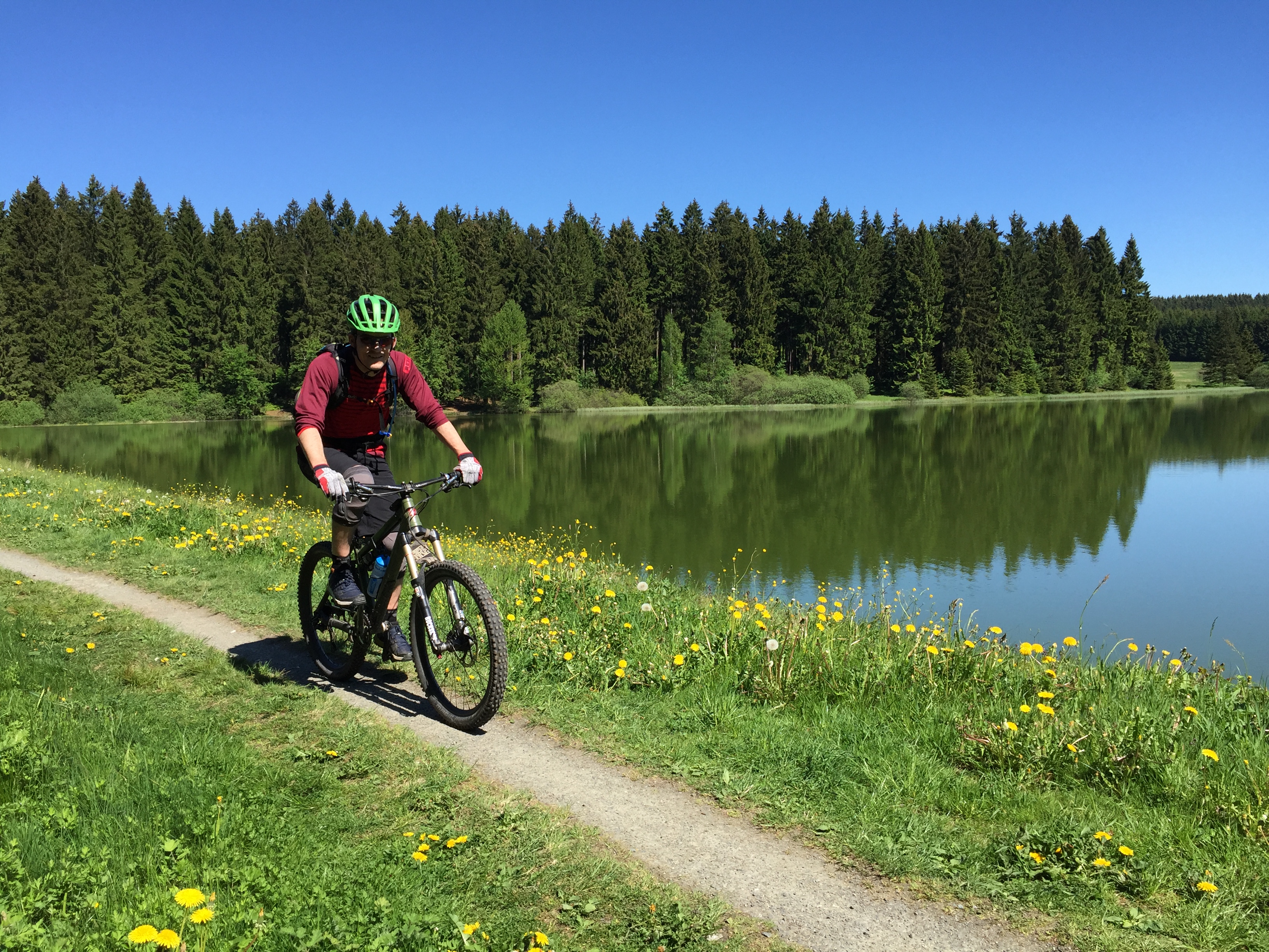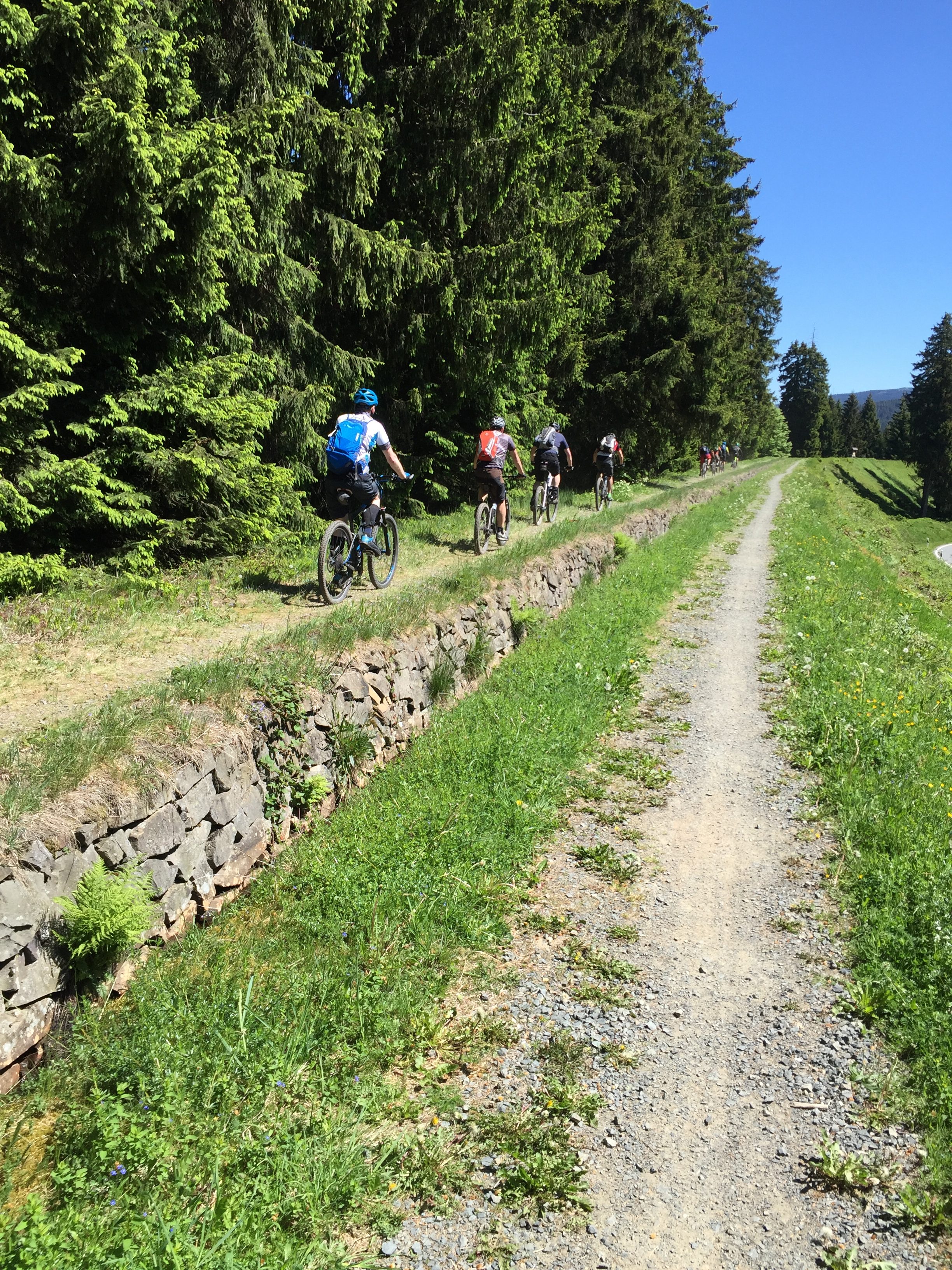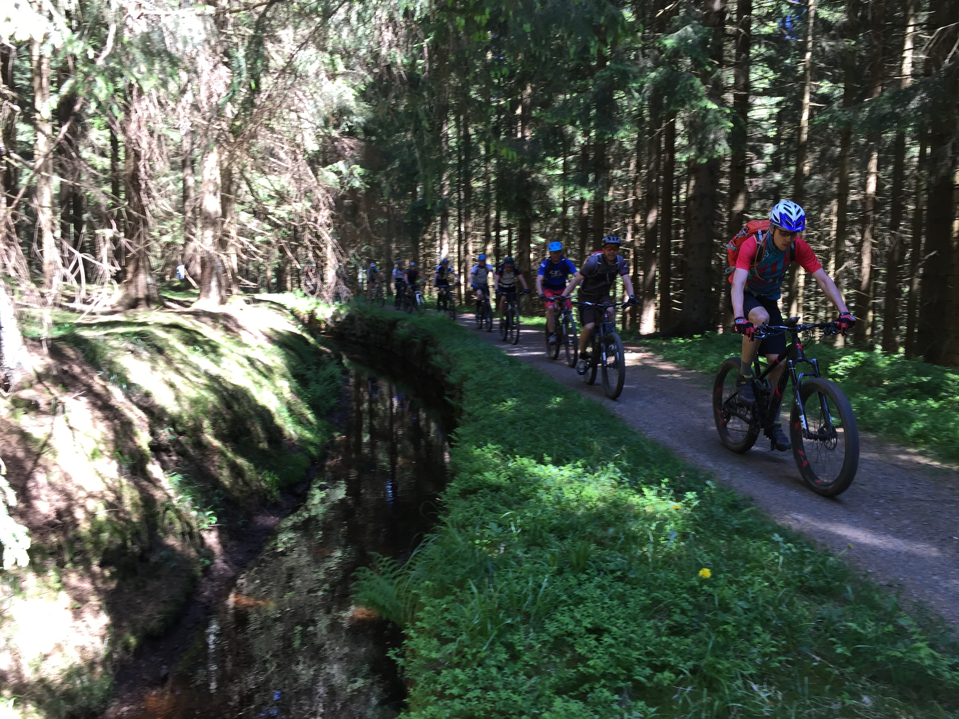 Die Gruppe rund um den Organisator Hans-Henning bestand aus 16 erfahrenen Mountainbikern, die in der Vergangenheit schon so manche Mountainbiketour absolviert und einige Mehrtagestour-Erfahrung gesammelt hatte. Die Vorgabe war eine erlebnis- und abwechslungsreiche Tour zusammenzustellen und einige schöne Trails zu kombinieren. Betreut wurde die Gruppe jeden Tag von zwei unserer ortskundigen Guides. Als Startpunkt legten wir Goslar am Nordharzrand fest und trafen die motivierten Biker am Morgen des 25.05. bei bestem, sonnigen Wetter an den H+ HOTELS. Nach dem Briefing und der Gepäckübergabe an unseren Shuttlebus, stiegen wir endlich in den Sattel und machten uns an die ersten Höhenmeter in Richtung Süd-Westen. Über breite Forstwege und vesteckte Pfade ging es über Kammwege, tiefe Fichtenwälder, flowige Abfahrten und um die Granetalsperre herum. In Wolfshagen hatten wir ein Grillbuffet reserviert und stärkten uns für die nächsten Kilometer der ersten Etappe. Nachdem wir Lautenthal passiert hatten und einige schöne Extra-Loops und Trails um Wildemann eingebaut hatten, kamen wir schließlich an unserer Unterkunft im kleinen Bergstädtchen Bad Grund an und freuten uns auf das Feierabendbier und ein zünftiges Abendessen.