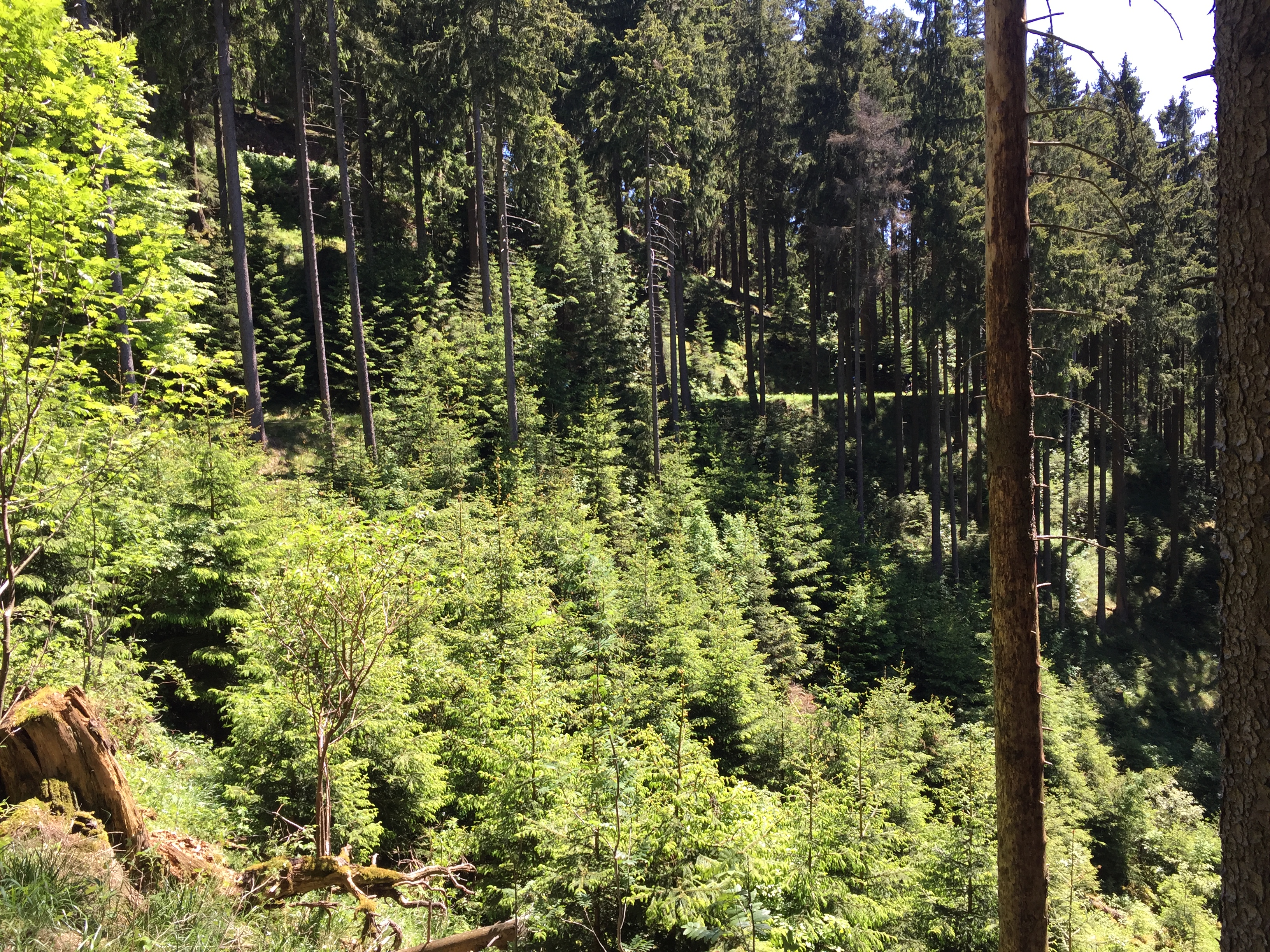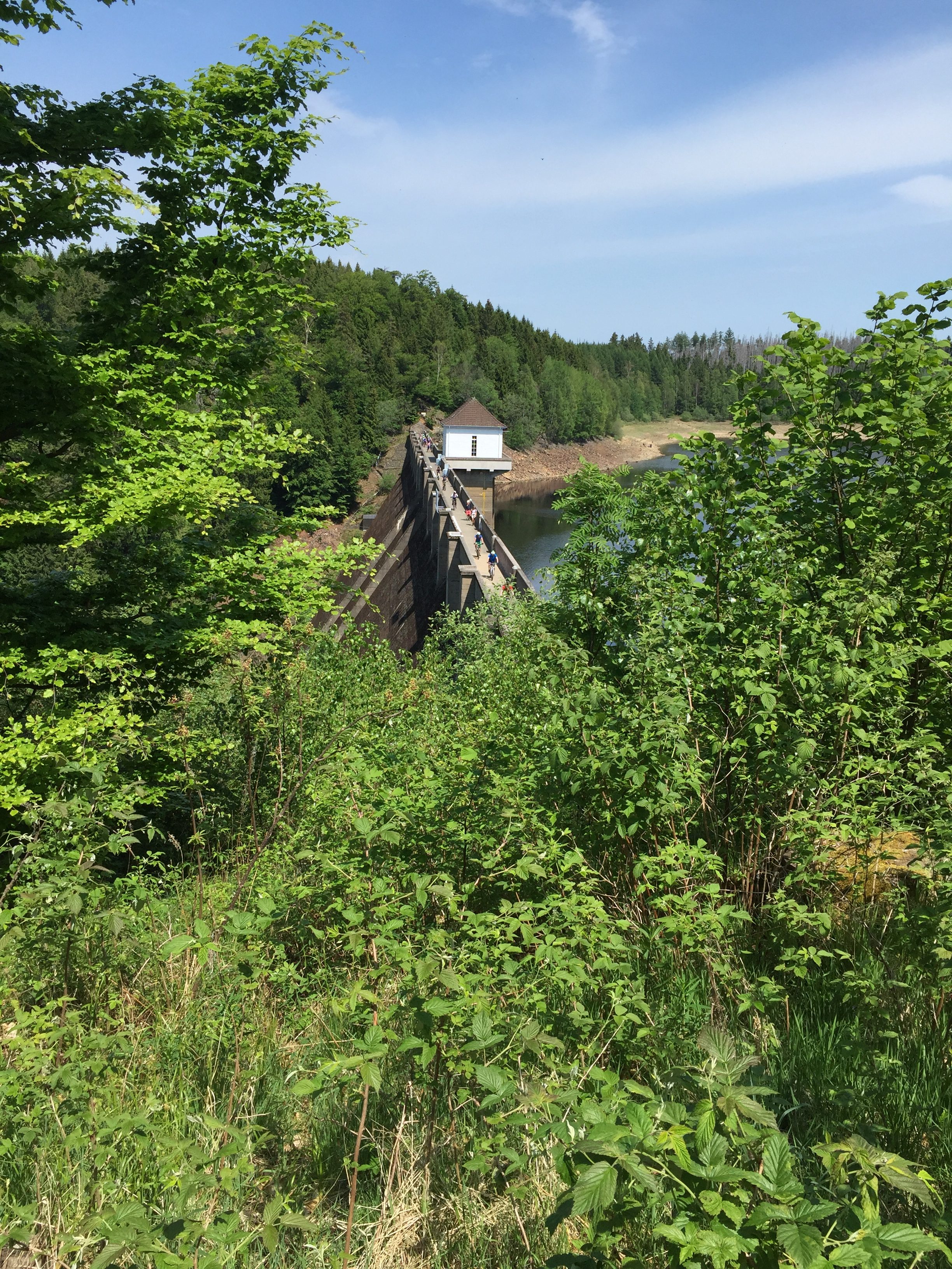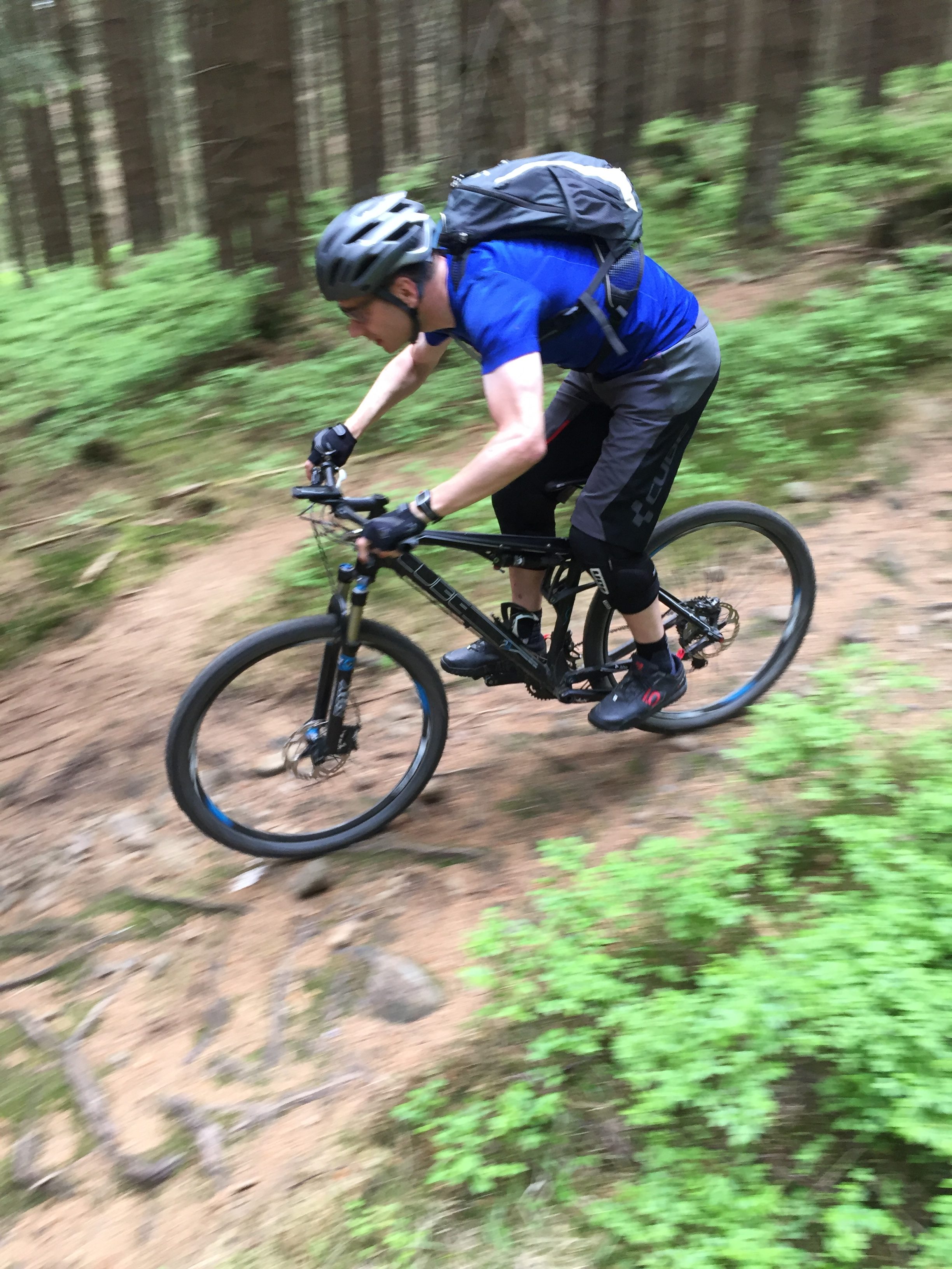 Die Gruppe rund um den Organisator Hans-Henning bestand aus 16 erfahrenen Mountainbikern, die in der Vergangenheit schon so manche Mountainbiketour absolviert und einige Mehrtagestour-Erfahrung gesammelt hatte. Die Vorgabe war eine erlebnis- und abwechslungsreiche Tour zusammenzustellen und einige schöne Trails zu kombinieren. Betreut wurde die Gruppe jeden Tag von zwei unserer ortskundigen Guides. Als Startpunkt legten wir Goslar am Nordharzrand fest und trafen die motivierten Biker am Morgen des 25.05. bei bestem, sonnigen Wetter an den H+ HOTELS. Nach dem Briefing und der Gepäckübergabe an unseren Shuttlebus, stiegen wir endlich in den Sattel und machten uns an die ersten Höhenmeter in Richtung Süd-Westen. Über breite Forstwege und vesteckte Pfade ging es über Kammwege, tiefe Fichtenwälder, flowige Abfahrten und um die Granetalsperre herum. In Wolfshagen hatten wir ein Grillbuffet reserviert und stärkten uns für die nächsten Kilometer der ersten Etappe. Nachdem wir Lautenthal passiert hatten und einige schöne Extra-Loops und Trails um Wildemann eingebaut hatten, kamen wir schließlich an unserer Unterkunft im kleinen Bergstädtchen Bad Grund an und freuten uns auf das Feierabendbier und ein zünftiges Abendessen.
