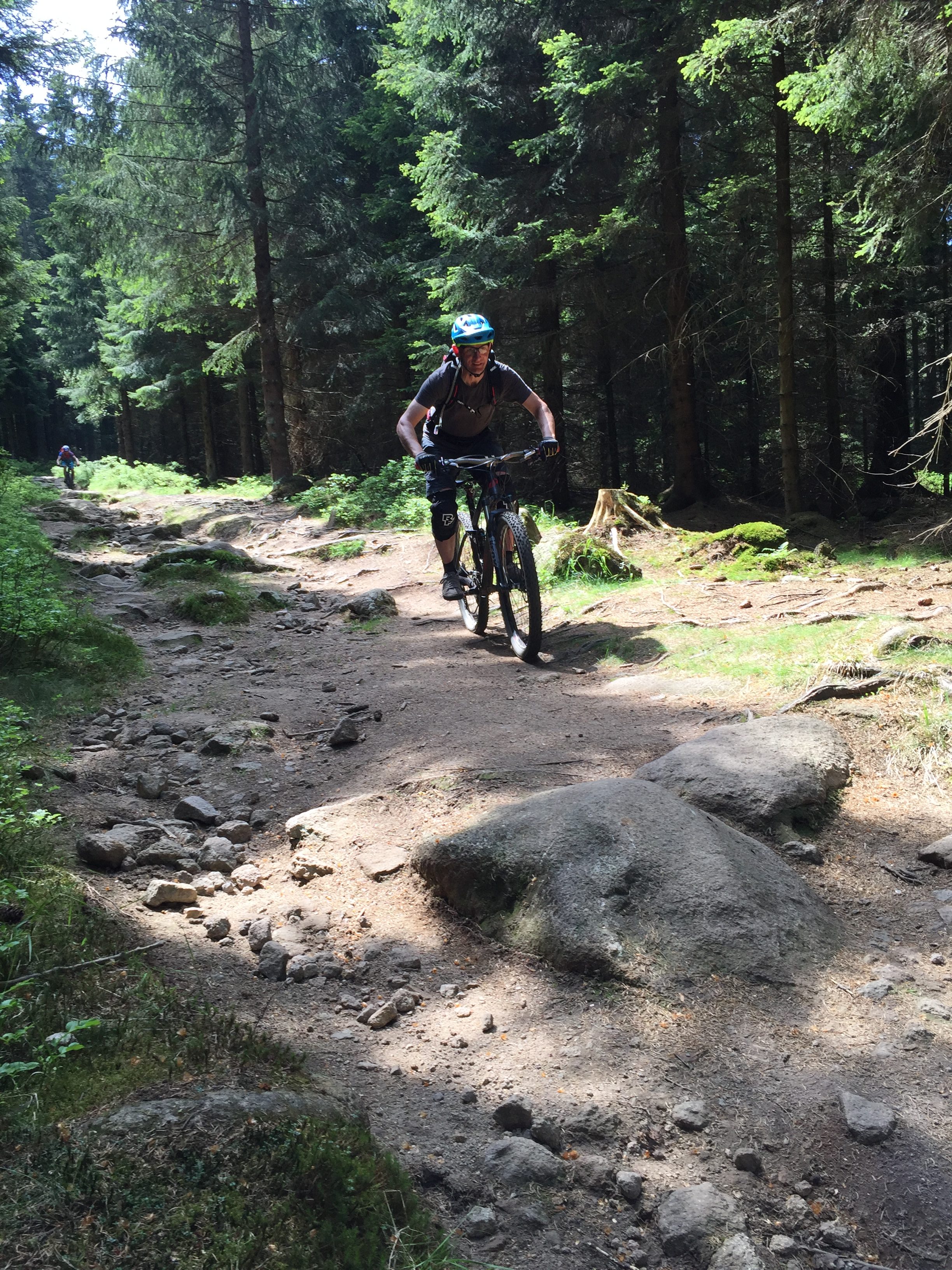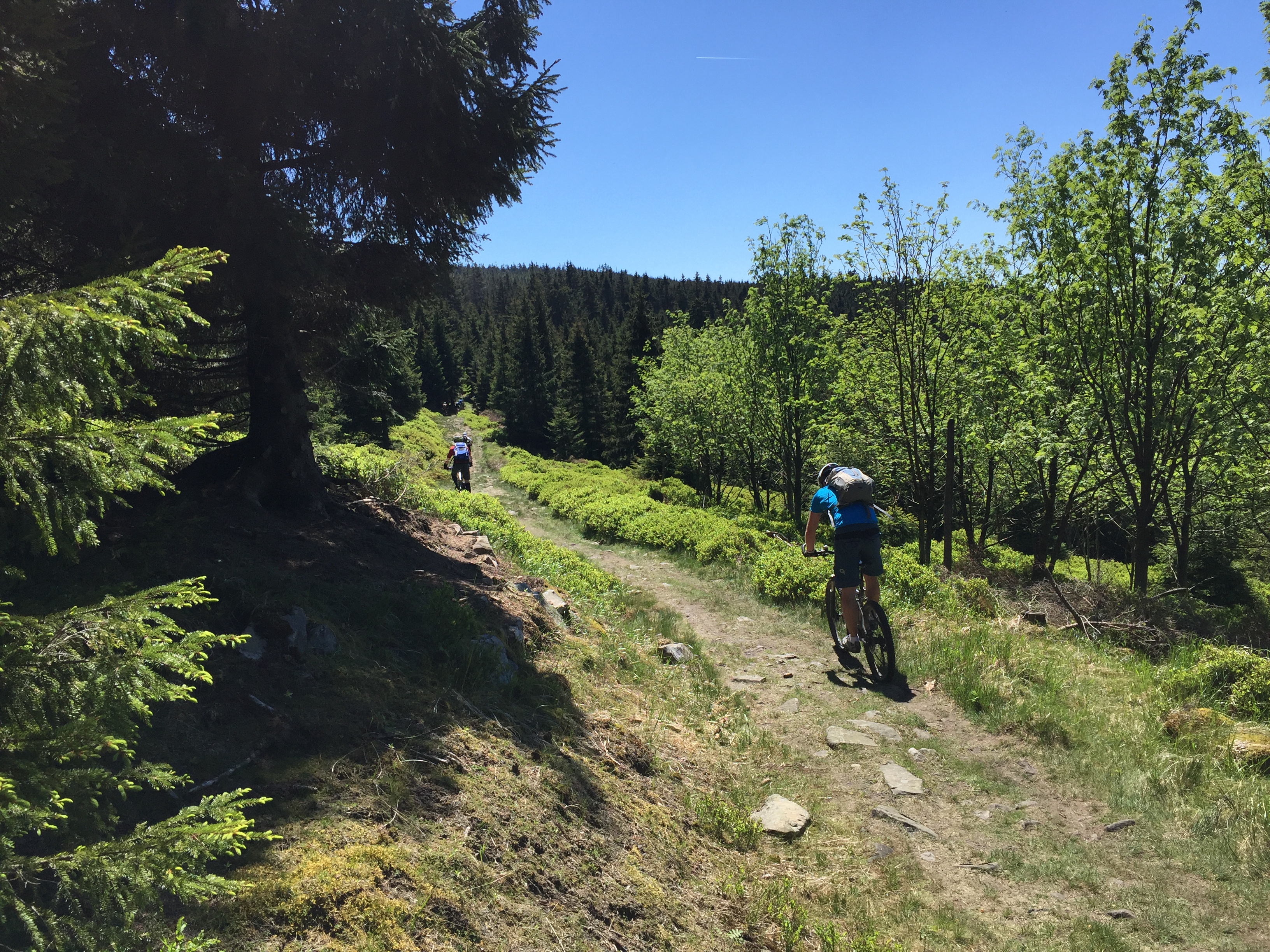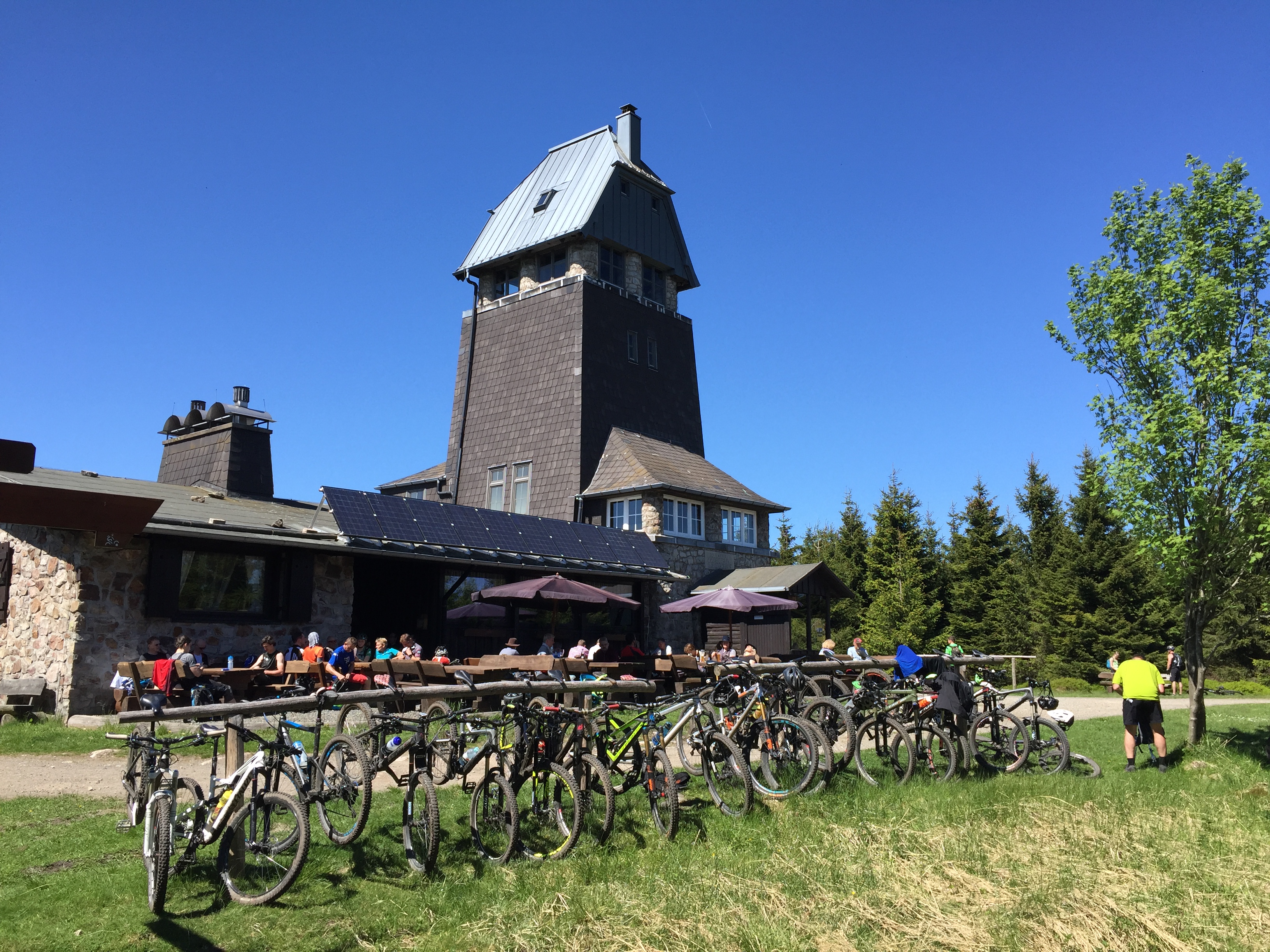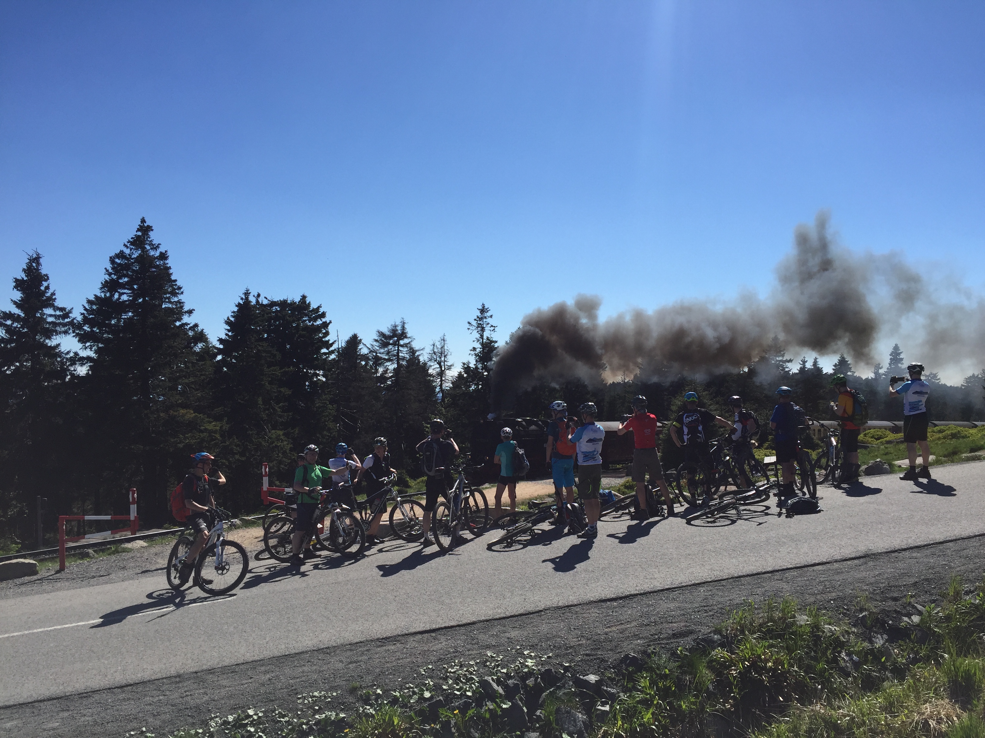 Der dritte Tag unserer Trans Harz Tour und gleichzeitig auch die Königsetappe mit dem Brocken als Highlight, sollte uns auch nochmal konditionell einiges abverlangen – waren doch Temperaturen um die 25-30 Grad und hohe Luftfeuchte angesagt. Doch nach dem reichhaltigen Frühstücksbuffet kamen wir sehr gut voran und erklommen die ersten Höhenmeter hinauf zum Gipfel des Stöberhai. Von hier aus konnte man den weiteren Verlauf der Etappe erahnen und so rollten wir kurz darauf weiter und unserem nächsten Ziel Braunlage entgegen. Hier verweilten wir aber nicht allzu lange und nachdem wir uns den Weg durch die Menschenmassen vor dem Wurmberg gebahnt hatten, tauchten wir wieder ein in den Wald und die Trails in Richtung Osten. Kurz darauf waren wir schon in Sachsen-Anhalt und kehrten beim Brockenwirt in Schierke zu einer kurzen Mittagspause ein. Danach folgte der Aufstieg zum Brocken, doch auch hier kamen wir sehr gut voran und fuhren mit nur leicht auseinander gezogenem Feld auf das Plateau des Brockengipfels ein. Die Sicht war grandios und für die meisten der Teilnehmer war es der erste Besuch auf dem Gipfel. Jetzt hieß es aber erstmal wieder Höhenmeter vernichten und mit viel Flow ging es über schöne Wege und Trails hinunter nach Oderbrück, zum Oderteich und um den Rehberg herum. Ein kurzer Stop in der Abendsonne an unserem Hotspot dem Rehberger Grabenhaus durfte natürlich nicht fehlen. Dann checkten wir in unserer Unterkunft am Internationalen Haus Sonnenberg ein und Guide Jan bereitete schon mal das Abendessen an der Grillhütte auf dem Gelände vor. Leckeres vom Grill, Bier gekühlt im angrenzenden Bach und ein Blick durch die Teleskope der Sternenwarte rundeten den perfekten Mountainbiketag ab.