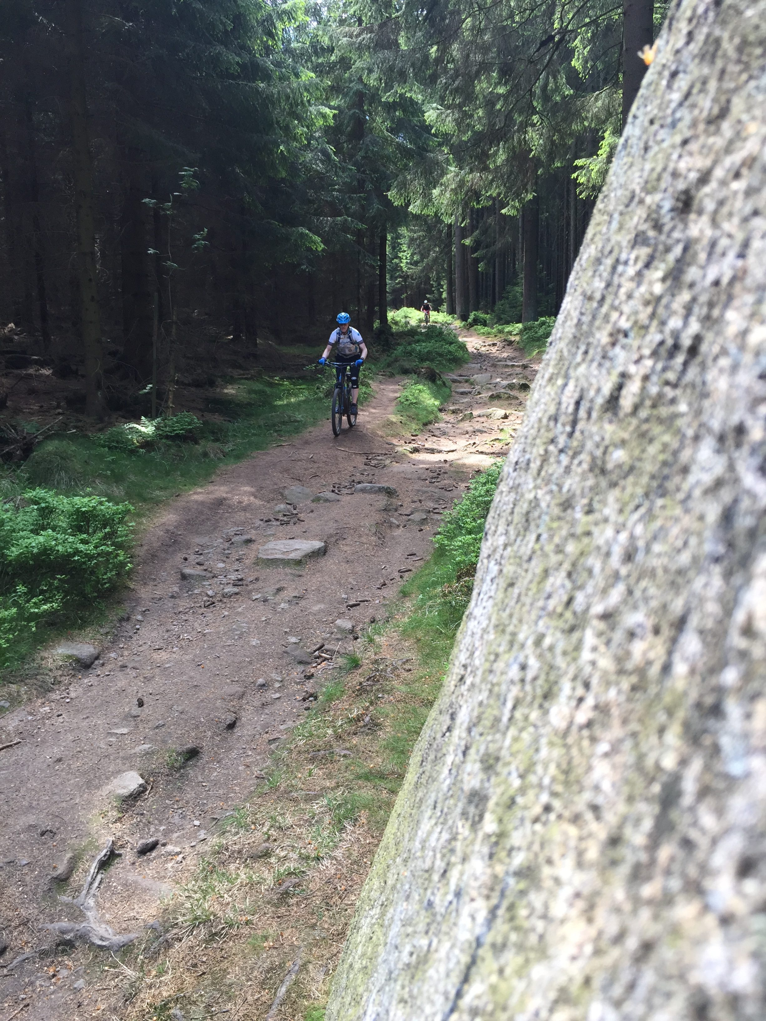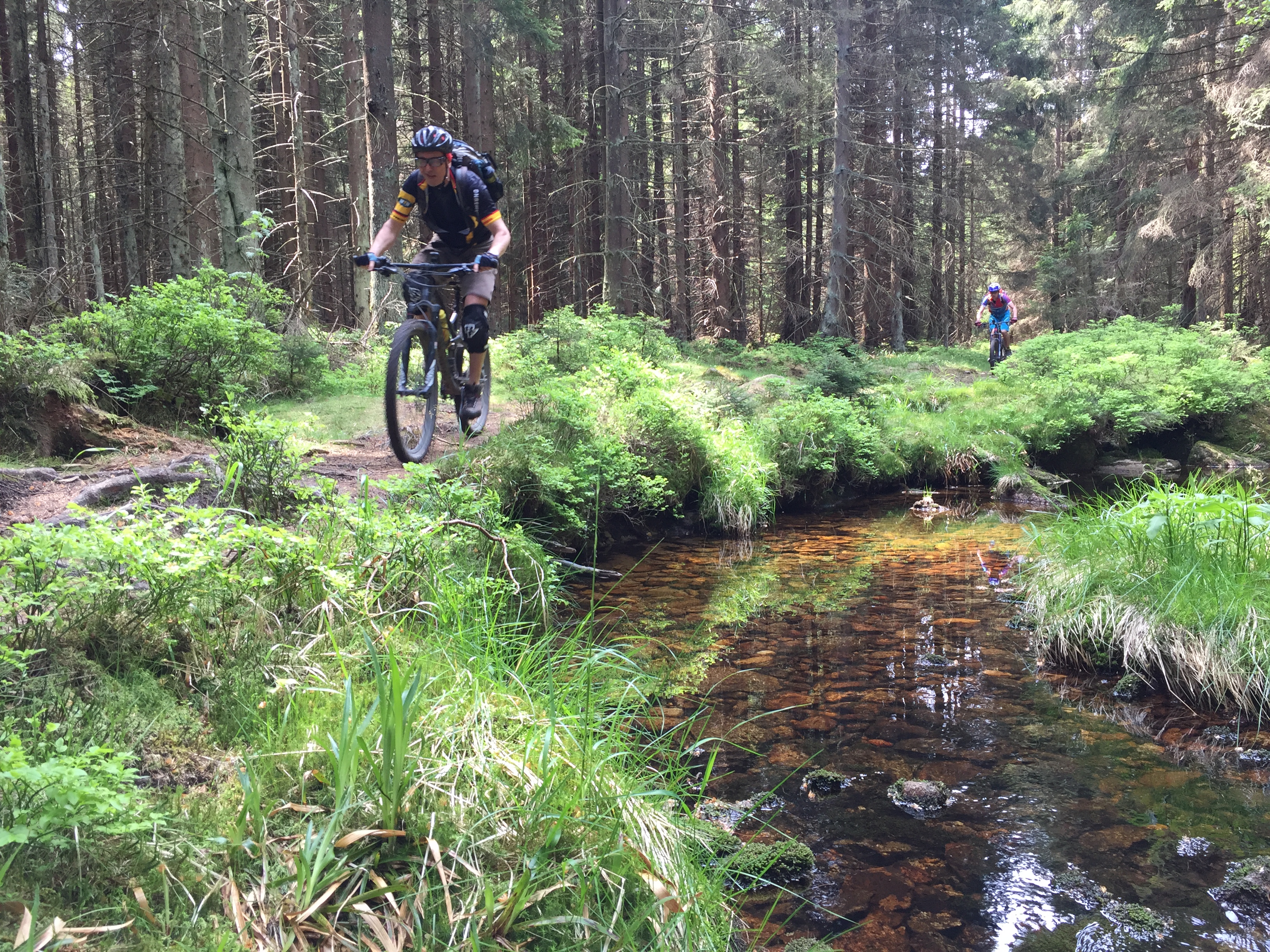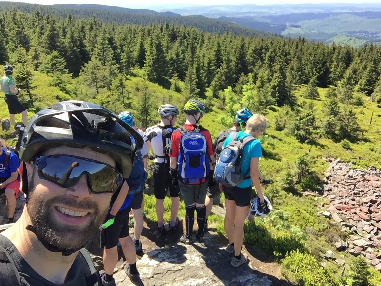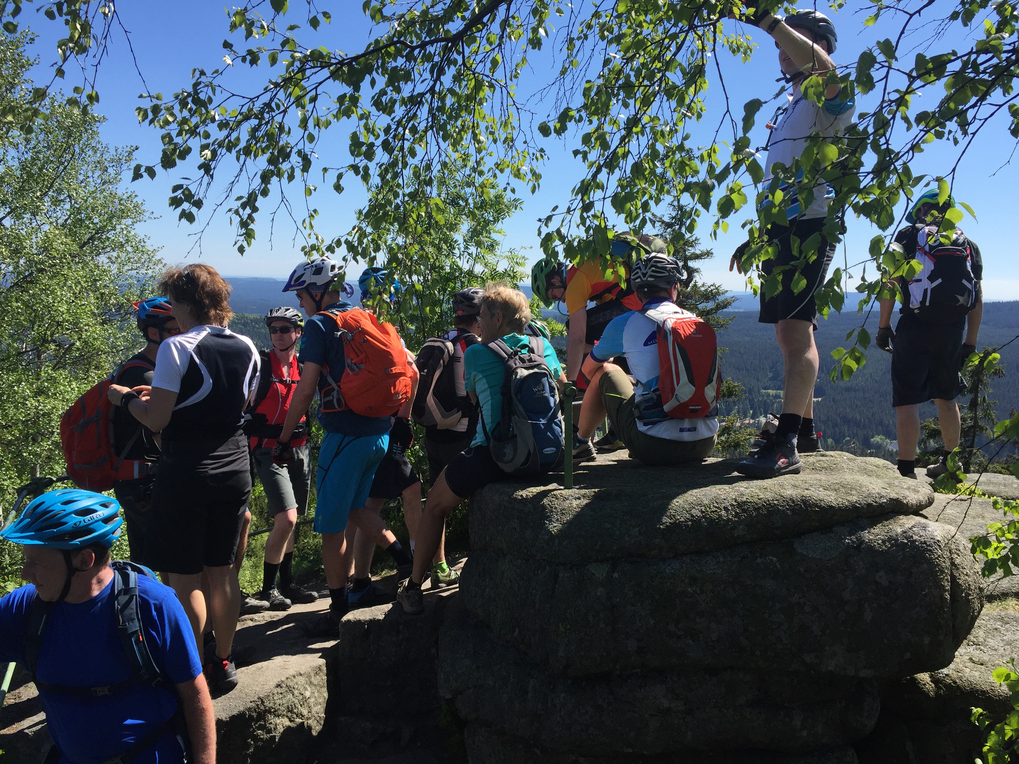Der dritte Tag unserer Trans Harz Tour und gleichzeitig auch die Königsetappe mit dem Brocken als Highlight, sollte uns auch nochmal konditionell einiges abverlangen – waren doch Temperaturen um die 25-30 Grad und hohe Luftfeuchte angesagt. Doch nach dem reichhaltigen Frühstücksbuffet kamen wir sehr gut voran und erklommen die ersten Höhenmeter hinauf zum Gipfel des Stöberhai. Von hier aus konnte man den weiteren Verlauf der Etappe erahnen und so rollten wir kurz darauf weiter und unserem nächsten Ziel Braunlage entgegen. Hier verweilten wir aber nicht allzu lange und nachdem wir uns den Weg durch die Menschenmassen vor dem Wurmberg gebahnt hatten, tauchten wir wieder ein in den Wald und die Trails in Richtung Osten. Kurz darauf waren wir schon in Sachsen-Anhalt und kehrten beim Brockenwirt in Schierke zu einer kurzen Mittagspause ein. Danach folgte der Aufstieg zum Brocken, doch auch hier kamen wir sehr gut voran und fuhren mit nur leicht auseinander gezogenem Feld auf das Plateau des Brockengipfels ein. Die Sicht war grandios und für die meisten der Teilnehmer war es der erste Besuch auf dem Gipfel. Jetzt hieß es aber erstmal wieder Höhenmeter vernichten und mit viel Flow ging es über schöne Wege und Trails hinunter nach Oderbrück, zum Oderteich und um den Rehberg herum. Ein kurzer Stop in der Abendsonne an unserem Hotspot dem Rehberger Grabenhaus durfte natürlich nicht fehlen. Dann checkten wir in unserer Unterkunft am Internationalen Haus Sonnenberg ein und Guide Jan bereitete schon mal das Abendessen an der Grillhütte auf dem Gelände vor. Leckeres vom Grill, Bier gekühlt im angrenzenden Bach und ein Blick durch die Teleskope der Sternenwarte rundeten den perfekten Mountainbiketag ab.