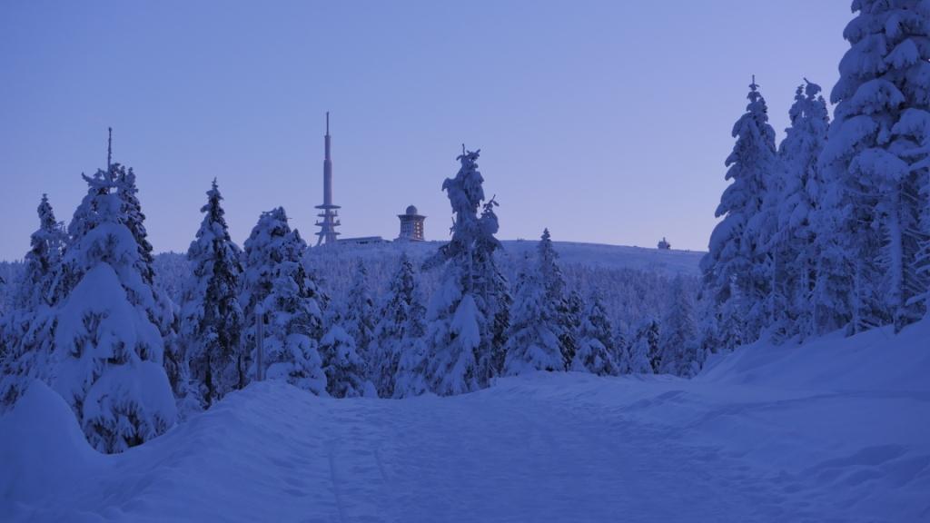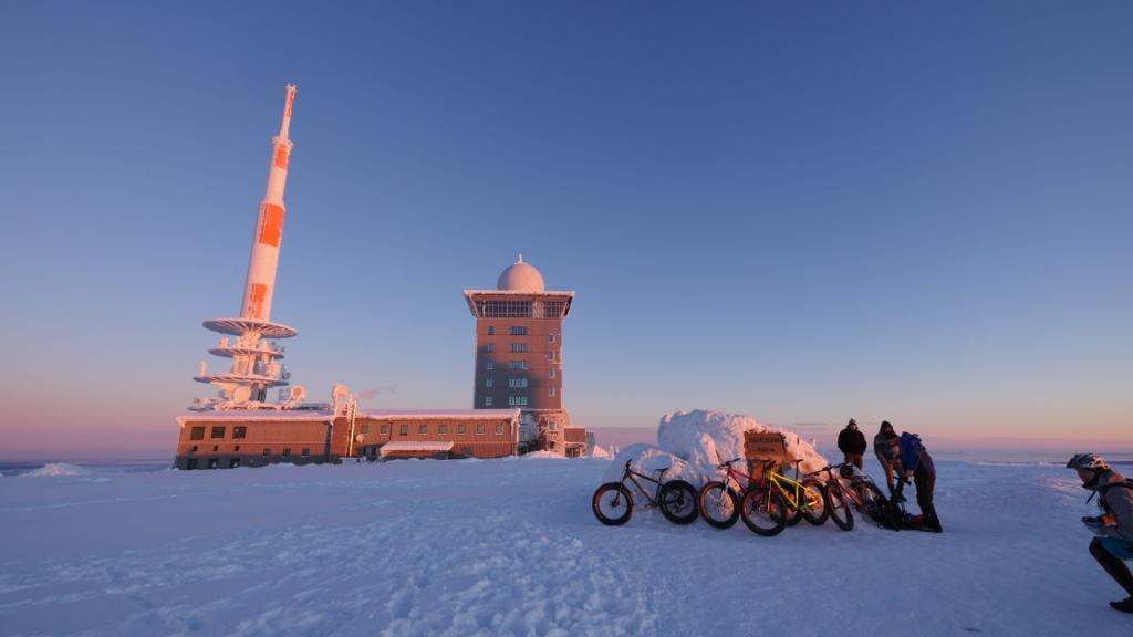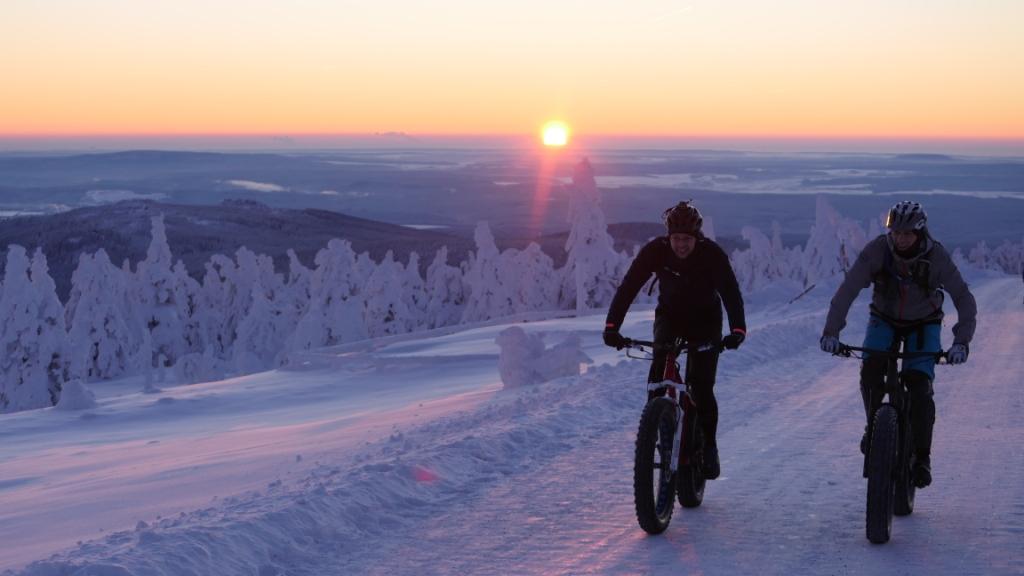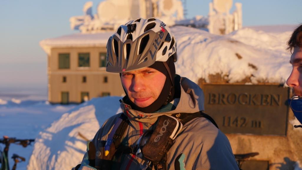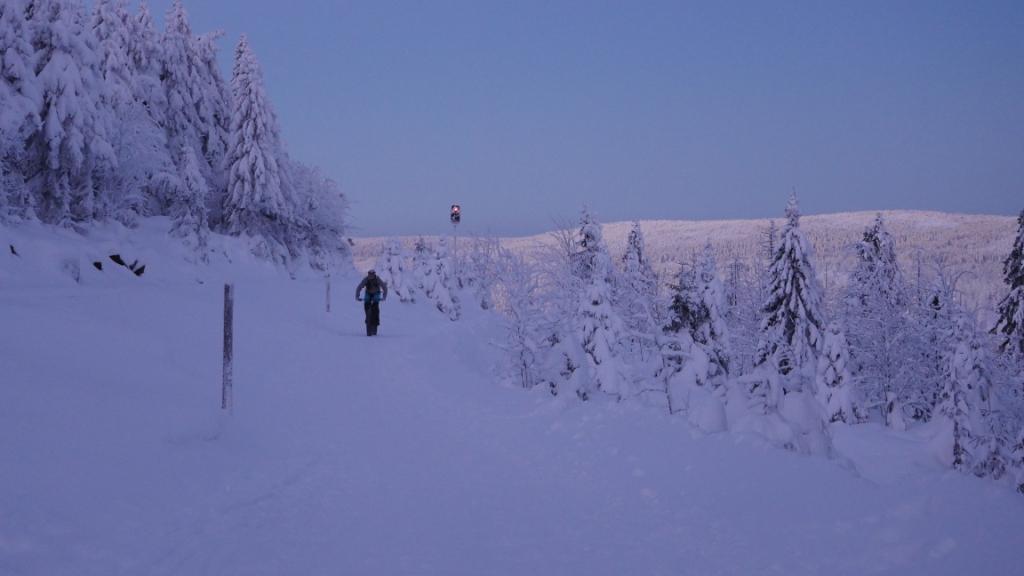 Irgendetwas lässt mich hochschrecken. War da ein Geräusch? Im Zimmer herrscht Dunkelheit und hinter dem Fensterglas noch stockfinstere Nacht. Ich drehe mich auf die Seite, reibe mir die Augen und da ist es wieder. Mein Wecker macht sich eindringlich bemerkbar und es schießt mir wieder ins Gedächtnis. Gleich werden Arne und Joschi vor der Tür stehen und mich mitsamt meinem Bike einladen wollen. Es ist 5.15 Uhr und zwar nicht super früh aber trotzdem früh. Ich gähne lange und ausgiebig und versuche den ziemlich schweren Schweinehund von mir herunter zu welzen. Geschafft. Meine beiden Hunde haben spitz gekriegt das irgendetwas vor sich geht und schleichen zusammen mit mir durchs Treppenhaus in die Küche. Jetzt erstmal einen Kaffee, dann der ganze Rest. Verdammt, schon 5.30 Uhr und mir bleiben noch genau 20 Minuten um Startklar zu sein. Meine beiden Kollegen haben sicher wenig Lust bei aktuell -15° Grad vor der Tür zu warten.Wir wuchten die Bikes ins Auto und installieren den Heckträger. Ich muss für Ricardo von DEIN HARZ ein zusätzliches Bike einpacken, denn er begleitet uns heute auf unserem „earlybird“ und will ein paar Fotos und Videosequenzen schießen. Dann geht es los und wir versuchen unsere Finger in die Lüftungsschlitze des Wagens zu stecken um wieder etwas Gefühl darin zu bekommen. Die Temperatur fällt kurz hinter Bad Lauterberg auf – 18° Grad und wir freuen uns schon sehr auf den baldigen Zusammenbau der Bikes. Noch ist es dunkel. Die verschneite Harz Landschaft rauscht an uns vorbei, wir fahren immer tiefer in den Harz hinein und dann sind wir auch schon da. Starten wollen wir heute in Oderbrück. Von hier aus kommt man bequem über einige schöne Wege zum Goetheweg und schließlich über die Brockenstraße hinauf zum Brockenplateau. Ziel ist natürlich der Sonnenaufgang, das einmalige Licht und der gigantische Ausblick ins Harzer Umland. Wir begrüßen Ricardo, fummeln mit kalten Fingern noch kältere Fahrradteile aneinander und schlüpfen schließlich in unsere eisigen Handschuhe. Puh, die ersten Meter sind immer die härtesten und es dauert eine Weile bis man bei diesen Bedingungen auf Betriebstemperatur gekommen ist. Die Tatsache das ich immer wieder kurz vorsprinten, meinen Rucksack abziehen, die Kamera auspacken und diese ohne meine Handschuhe bedienen muss, macht es nicht gerade angenehmer. Aber genug geheult. Meine Finger sind mittlerweile warm und auch meine Lunge hat sich an die morgendliche Frischluftzufuhr gewöhnt. Schon bald erreichen wir nach dem Dreieckigen Pfahl und der Kreuzung am Eckersprung das Steilstück vor dem alten Goethebahnhof. Eigentlich war der Plan ein Schwitzen zu vermeiden und dieses Stück entspannt zu schieben. Johannes vor mir macht aber leider keinerlei Anstalten nun endlich vom Bike zu steigen und kämpft sich Meter für Meter über den Schnee hinauf. Das Thema Absteigen hat sich dann für mich erledigt und der Sportsgeist taucht plötzlich neben mir aus den Fichten auf und ich hefte mich an die breiten Reifen meines Vordermanns. Wir schwitzen und Schneekristalle glitzern auf den Rahmen unsere Mountainbikes. Das Morgenlicht verändert sich langsam, das dunkle Blau weicht nach und nach einem warmen Orange. Als wir schließlich auf die Brockenstraße treffen, sind es nur noch 20 Minuten bis zum Sonnenaufgang. Jetzt heisst es nicht lange Fackeln und die letzten Höhenmeter in Angriff nehmen. Dann haben wir es geschafft. Ein winziger hell leutender Punkt schiebt sich aus der Nebelwand am östlichen Horizont und ein neuer Tag im Harz beginnt. Das Morgenlicht verwandelt sich jetzt mit jeder Minute weiter, wird weicher und scheint selbst die gefrorene und verschneite Landschaft aufzuwärmen. Wir stehen am Brockenplateau und klatschen ab. der Gipfel. Wir waren ja schon öfter hier oben aber die Erfahrung nach einer anstrengenden Auffahrt mit dieser magischen Atmosphäre belohnt zu werden ist immer wieder faszinierend. Noch schnell ein paar Fotos geschossen, dann geht es auch schon wieder hinab ins Tal und in Richtung Oderbrück. Entspannt rollen wir die Brockenstraße und den Goetheweg hinab und genießen jeden Meter. Unterwegs begegnen uns die ersten Wanderer und Langläufer und grüßen freundlich. Dann haben wir auch schon wieder den Parkplatz erreicht und ein Grinsen im gefrorenen Gesicht. Schade das es schon vorbei ist. Aber in unseren Köpfen spukt schon der nächste Plan für einen weiteren, noch genialeren Earlybird oder Snowride durch den Harz.