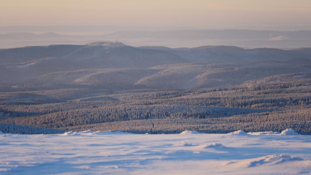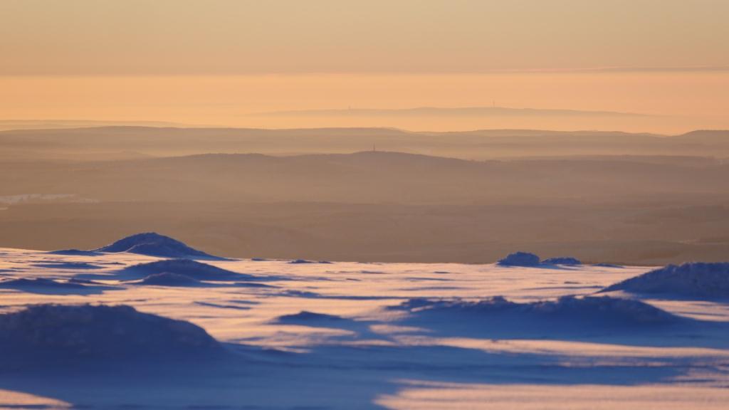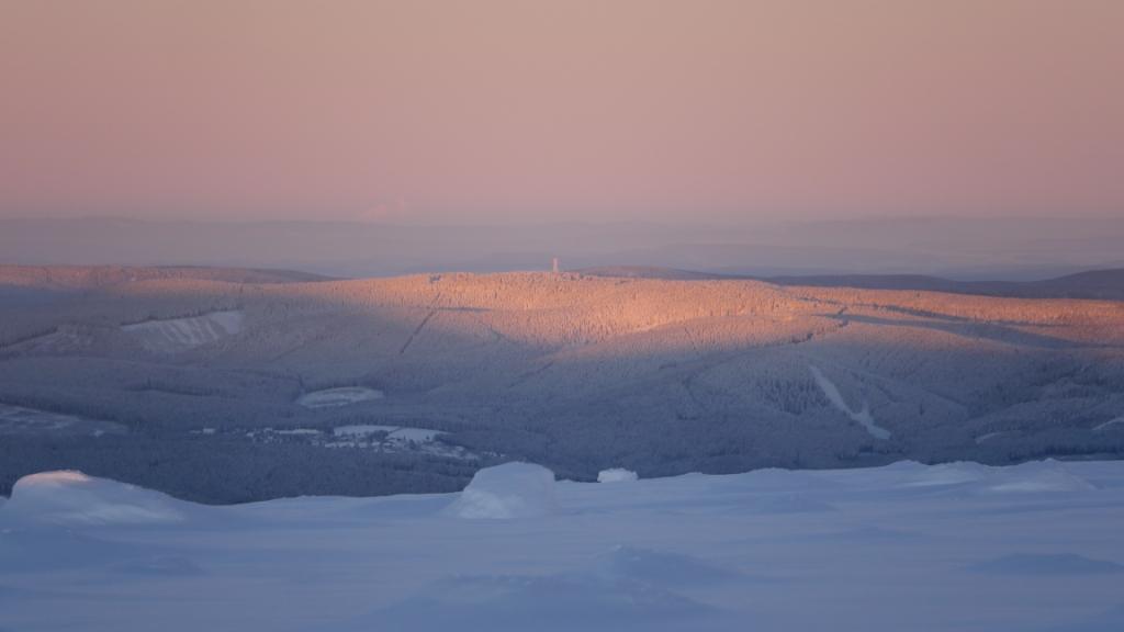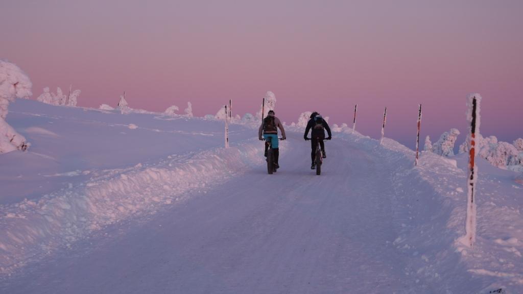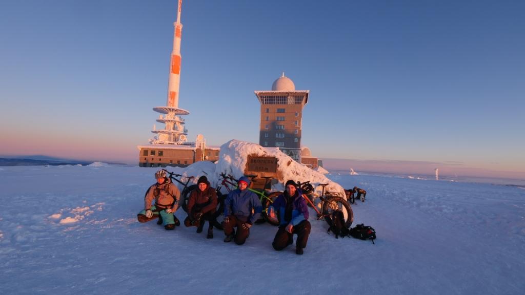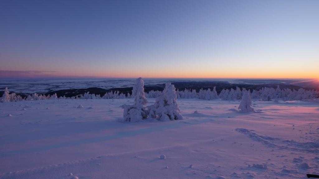 Irgendetwas lässt mich hochschrecken. War da ein Geräusch? Im Zimmer herrscht Dunkelheit und hinter dem Fensterglas noch stockfinstere Nacht. Ich drehe mich auf die Seite, reibe mir die Augen und da ist es wieder. Mein Wecker macht sich eindringlich bemerkbar und es schießt mir wieder ins Gedächtnis. Gleich werden Arne und Joschi vor der Tür stehen und mich mitsamt meinem Bike einladen wollen. Es ist 5.15 Uhr und zwar nicht super früh aber trotzdem früh. Ich gähne lange und ausgiebig und versuche den ziemlich schweren Schweinehund von mir herunter zu welzen. Geschafft. Meine beiden Hunde haben spitz gekriegt das irgendetwas vor sich geht und schleichen zusammen mit mir durchs Treppenhaus in die Küche. Jetzt erstmal einen Kaffee, dann der ganze Rest. Verdammt, schon 5.30 Uhr und mir bleiben noch genau 20 Minuten um Startklar zu sein. Meine beiden Kollegen haben sicher wenig Lust bei aktuell -15° Grad vor der Tür zu warten.Wir wuchten die Bikes ins Auto und installieren den Heckträger. Ich muss für Ricardo von DEIN HARZ ein zusätzliches Bike einpacken, denn er begleitet uns heute auf unserem „earlybird“ und will ein paar Fotos und Videosequenzen schießen. Dann geht es los und wir versuchen unsere Finger in die Lüftungsschlitze des Wagens zu stecken um wieder etwas Gefühl darin zu bekommen. Die Temperatur fällt kurz hinter Bad Lauterberg auf – 18° Grad und wir freuen uns schon sehr auf den baldigen Zusammenbau der Bikes. Noch ist es dunkel. Die verschneite Harz Landschaft rauscht an uns vorbei, wir fahren immer tiefer in den Harz hinein und dann sind wir auch schon da. Starten wollen wir heute in Oderbrück. Von hier aus kommt man bequem über einige schöne Wege zum Goetheweg und schließlich über die Brockenstraße hinauf zum Brockenplateau. Ziel ist natürlich der Sonnenaufgang, das einmalige Licht und der gigantische Ausblick ins Harzer Umland. Wir begrüßen Ricardo, fummeln mit kalten Fingern noch kältere Fahrradteile aneinander und schlüpfen schließlich in unsere eisigen Handschuhe. Puh, die ersten Meter sind immer die härtesten und es dauert eine Weile bis man bei diesen Bedingungen auf Betriebstemperatur gekommen ist. Die Tatsache das ich immer wieder kurz vorsprinten, meinen Rucksack abziehen, die Kamera auspacken und diese ohne meine Handschuhe bedienen muss, macht es nicht gerade angenehmer. Aber genug geheult. Meine Finger sind mittlerweile warm und auch meine Lunge hat sich an die morgendliche Frischluftzufuhr gewöhnt. Schon bald erreichen wir nach dem Dreieckigen Pfahl und der Kreuzung am Eckersprung das Steilstück vor dem alten Goethebahnhof. Eigentlich war der Plan ein Schwitzen zu vermeiden und dieses Stück entspannt zu schieben. Johannes vor mir macht aber leider keinerlei Anstalten nun endlich vom Bike zu steigen und kämpft sich Meter für Meter über den Schnee hinauf. Das Thema Absteigen hat sich dann für mich erledigt und der Sportsgeist taucht plötzlich neben mir aus den Fichten auf und ich hefte mich an die breiten Reifen meines Vordermanns. Wir schwitzen und Schneekristalle glitzern auf den Rahmen unsere Mountainbikes. Das Morgenlicht verändert sich langsam, das dunkle Blau weicht nach und nach einem warmen Orange. Als wir schließlich auf die Brockenstraße treffen, sind es nur noch 20 Minuten bis zum Sonnenaufgang. Jetzt heisst es nicht lange Fackeln und die letzten Höhenmeter in Angriff nehmen. Dann haben wir es geschafft. Ein winziger hell leutender Punkt schiebt sich aus der Nebelwand am östlichen Horizont und ein neuer Tag im Harz beginnt. Das Morgenlicht verwandelt sich jetzt mit jeder Minute weiter, wird weicher und scheint selbst die gefrorene und verschneite Landschaft aufzuwärmen. Wir stehen am Brockenplateau und klatschen ab. der Gipfel. Wir waren ja schon öfter hier oben aber die Erfahrung nach einer anstrengenden Auffahrt mit dieser magischen Atmosphäre belohnt zu werden ist immer wieder faszinierend. Noch schnell ein paar Fotos geschossen, dann geht es auch schon wieder hinab ins Tal und in Richtung Oderbrück. Entspannt rollen wir die Brockenstraße und den Goetheweg hinab und genießen jeden Meter. Unterwegs begegnen uns die ersten Wanderer und Langläufer und grüßen freundlich. Dann haben wir auch schon wieder den Parkplatz erreicht und ein Grinsen im gefrorenen Gesicht. Schade das es schon vorbei ist. Aber in unseren Köpfen spukt schon der nächste Plan für einen weiteren, noch genialeren Earlybird oder Snowride durch den Harz.