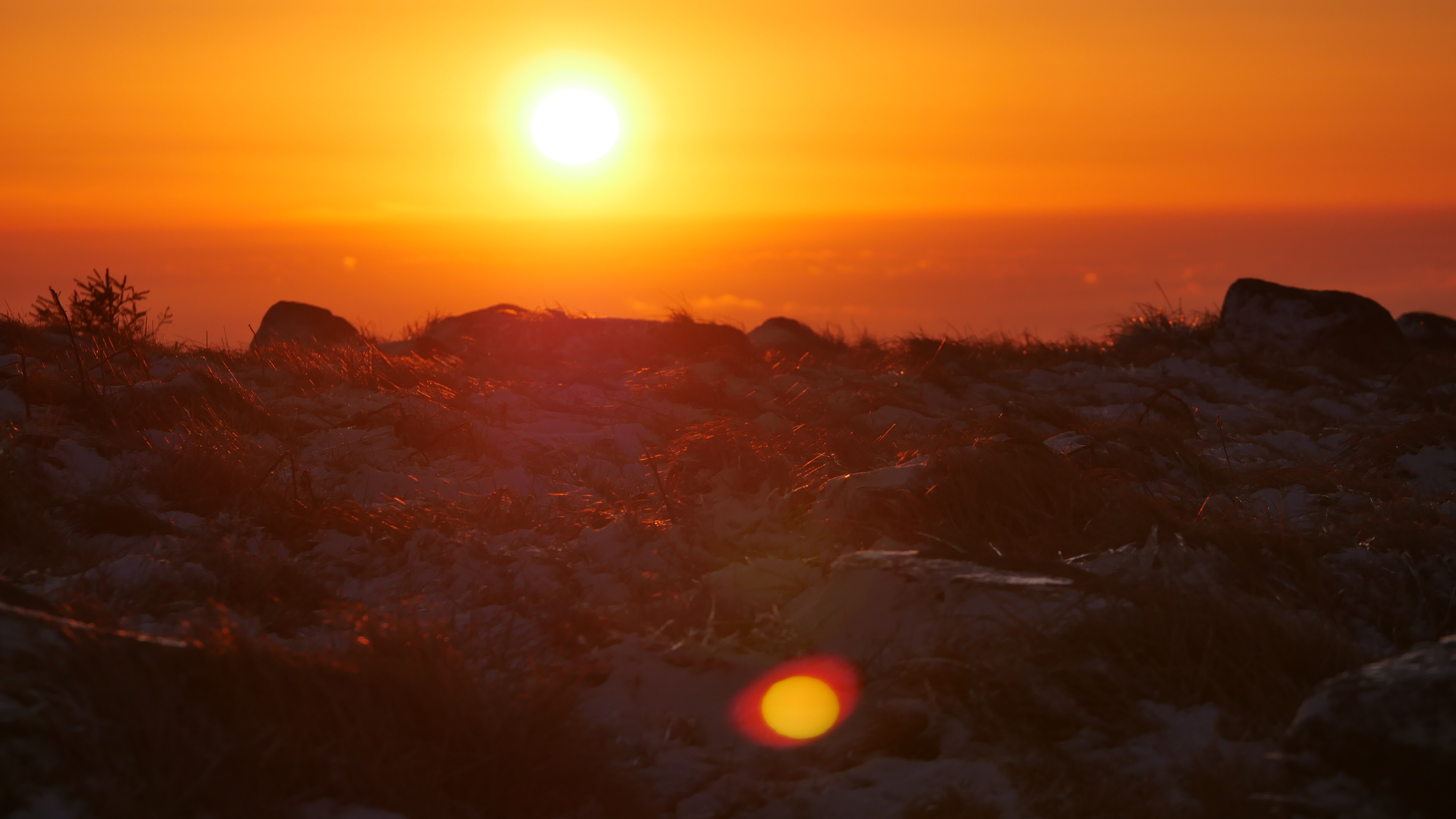 Die Sonne schiebt sich langsam durch die Wolken am Horizont.